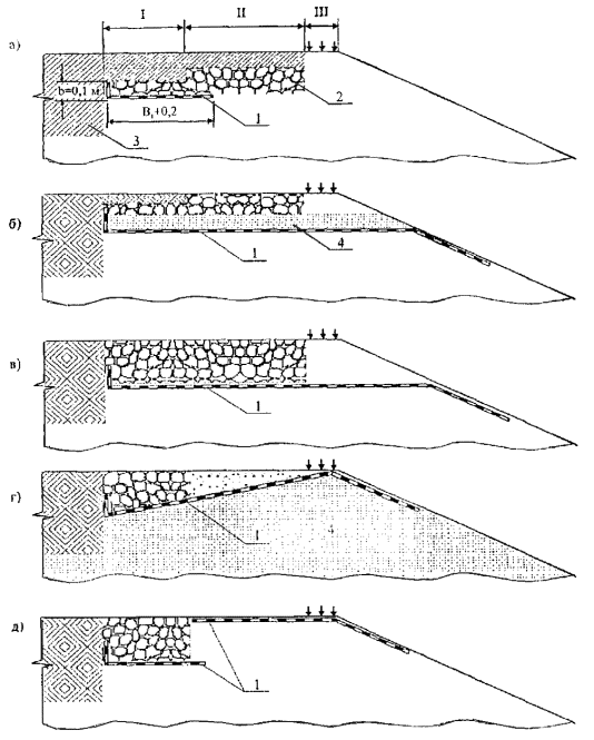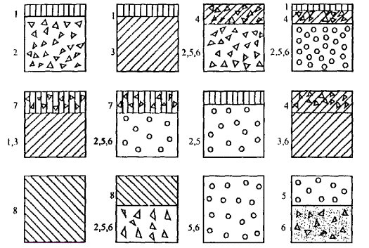 4.12. Проверка монолитных слоев на изгиб производится согласно положениям ОДН 218.046-01. 4.13. Если в конструкции укрепления обочины используются прослойки из геосинтетических материалов, величина расчетного модуля упругости конструкции умножается на коэффициент 1/α, где α - показатель, принимаемый по приложению 1 настоящего документа. 5. МАТЕРИАЛЫ ДЛЯ УКРЕПЛЕНИЯ ОБОЧИН5.1. Для укрепления обочин используются материалы: - асфальтобетон различных марок, асфальтогранулобетон, фиброасфальтобетон; - сборный цементобетон; - битумоминеральные смеси; - обработанные различными вяжущими щебеночные и гравийные материалы; - укрепленный различными вяжущими грунт; - щебеночные, гравийные и другие несвязные материалы, в т.ч. отходы камнедробильного производства, кирпичных, бетонных заводов, шлаки и другие местные материалы; - грунтощебеночные, грунтогравийные смеси. 5.2. Выбор материалов определяется требованиями раздела 2 с учетом особенностей работы материалов под нагрузкой в соответствующих грунтово-климатических условиях. Рекомендуемое расположение материалов в конструкции укрепления приведено на рис. 6. Рис. 6. Материалы слоев укрепления обочин: 1 - асфальтобетон, асфальтогранулобетон, фиброасфальтобетон, цементобетон; 2 - щебеночные материалы, шлаки; 3 - укрепленный неорганическими вяжущими грунт; 4 - щебень, гравий с пропиткой вяжущими материалами; 5 - гравийные (щебеночные) материалы; 6 - грунтогравийные, грунтощебеночные материалы, отходы производства (кирпичный бой, отходы бетонных заводов, породы угольных шахт и т.д.); 7 - битумоминеральные смеси; 8 - битумогрунт 5.3. Применяемые для укрепления обочин дорожно-строительные материалы должны соответствовать техническим условиям на их производство и применение. 5.4. При укреплении обочин асфальтобетоном низких марок для улучшения свойств целесообразно применять стекловолокна или базальтовые волокна ориентировочно из расчета 3 - 5 % от объема смеси. Расчетные характеристики армированного таким образом асфальтобетона следует повышать на 20 %. 5.5. При использовании для укрепления обочин обработанных вяжущими грунтов следует руководствоваться положениями специальных документов по их применению. 5.6. В условиях необходимости повышения прочности конструкции укрепления недостатка дорожно-строительных материалов, необходимости гидроизоляции земляного полотна или улучшения условий отвода воды используются геосинтетические материалы (ГМ), в группу которых входят нетканые, пленочные, сетчатые материалы и георешетки пространственного типа. Геосинтетические материалы должны отвечать требованиям технических условий на их производство и применение, обладать биологической и химической устойчивостью к воздействию агрессивных факторов. Место расположения ГМ в конструкции укрепления обочин (по ширине обочины и глубине заложения) определяется видом применяемого ГСМ и выполнением им указанных выше функций. 5.7. Нетканые ГМ представляют собой хаотично переплетенные короткие или длинные (бесконечные) волокна, соединенные механическим, физическим или химическим способами. ГМ, соединенные механическим способом (иглопрокалыванием), обладают, как правило, высокой водопроницаемостью во всех направлениях и при достаточной толщине выполняют функции дренирующих слоев и фильтров, но имеют повышенную деф