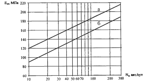 Рис. 5. Номограмма для расчета требуемого модуля упругости краевой у крепительной полосы: N0 - приведенное количество наездов автомобилей на краевую укрепительную полосу за сутки; а - покрытие из асфальтобетона, цементобетона, битумоминеральных смесей, приготовленных в установке; б - покрытия из битумоминеральных смесей, щебеночных и гравийных материалов, обработанных способами пропитки, песчаными и супесчаными укрепленными различными вяжущими грунтами где А - коэффициент, учитывающий количество наездов автомобилей на краевую укрепительную полосу, принимается по табл. 4.2; Nm - число проездов автомобилей по дороге m-й марки в сутки; Smсум - суммарный коэффициент приведения к расчетной нагрузке, принимаемый по приложению 1 ОДН 218.046.01. Таблица 4.2