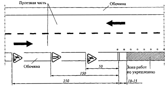 6.6. Раскатку рулонов и укладку полотен ГМ в рабочее положение выполняют с низовой (по отношению к направлению стока воды) стороны. Их положение закрепляют прижатием полотна к грунту через 10 - 12 м анкерами, присыпкой грунтом, щебенкой. Прижатие производят во избежание смещения полотна при действии ветровой нагрузки, укладке вышележащих слоев укрепления, а также для сохранения небольшого предварительного его натяжения. 6.7. При недостаточной ширине ГМ полотна укладывают с перекрытием не менее 0,10 - 0,15 м (при создании гидроизолирующих слоев - 0,3 м), а в случае возможности возникновения в месте перекрытия полотен значительных растягивающих напряжений их соединяют. Соединение выполняют, если: - перекрытие расположено в пределах краевой укрепительной полосы, а основной функцией ГМ в конструкции укрепления является армирование; - полотна укладывают с выходом на откос с целью его защиты, а перекрытие расположено в пределах 0,5 м от бровки откоса. Выбор способа соединения зависит от вида применяемого ГМ и функций, которые он выполняет в конструкции. 6.8. При устройстве прослоек из СМ, особенно гидроизолирующих, необходимо проверить качество планировки и соответствие поперечных уклонов проектным, качество швов соединения полотен. 6.9. Отсыпку на ГМ материала вышележащего слоя укрепления желательно вести с таким расчетом, чтобы ГМ (нестабилизированный) находился под действием дневного света не более 4 - 5 ч. Отсыпку материала ведут по способу «от себя» без заезда строительных машин на открытые полотна. Материал укрепления выгружают непосредственно на уложенные полотна, надвигают, разравнивают и профилируют бульдозером и автогрейдером, после чего уплотняют. При строительстве избегают резких поворотов гусеничных машин, так как это может привести к повреждению полотен ГМ. 6.10. Первый слой укрепления поверх ГМ отсыпают на толщину, не менее требуемой, исходя из данных расчета на строительные нагрузки (см. раздел 5). Если на поверхность ГМ укладывают крупнофракционный материал (щебень, гравий), а данные по стойкости ГМ к нетрадиционным воздействиям отсутствуют, проверяют возможность такой укладки путем визуальной оценки степени повреждения образца ГМ размерами 2 ´ 2 м после проезда построечного транспорта по покрывающему его слою. При наличии повреждений на полотно отсыпают технологический слой из мелкозернистого материала толщиной в уплотненном состоянии не менее 5 см (для пленок - 10 см). 6.11. Прослойку из геосинтетического материала под пространственную георешетку (при необходимости) устраивают согласно изложенным выше правилам. 6.12. Укладку георешетки производят путем растяжки пакета и прикрепления (фиксации положения) георешетки к грунту земляного полотна штырями по всему ее периметру. 6.13. Отсыпку материала в ячейки георешетки выполняют одновременно на всю высоту георешетки с запасом ориентировочно 15 см для защиты ребер георешетки от смятия уплотняющими и транспортными машинами. 6.14. Планировку и уплотнение материала-заполнителя георешетки выполняют обычным способом согласно СНиП 3.06.03-85. 6.15. Работы по укреплению обочин следует производить в соответствии с действующими правилами по технике безопасности. Примерная схема расположения дорожных знаков и ограждений при производстве работ показана на рис. 7. Рис. 7. Схема ограждения участ