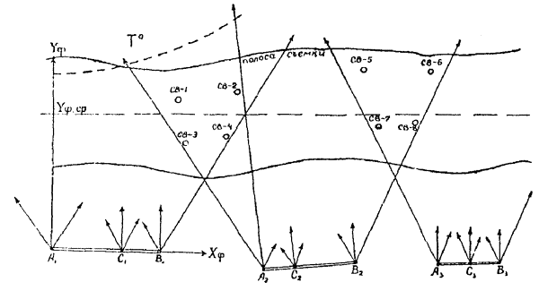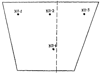 В пределах участка местности, покрываемого каждой стереопарой, намечают не менее трех корректурных точек (рис. 8). Координаты этих точек определяют в результате геодезических измерений.