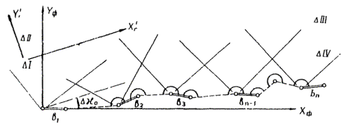 4.22. Для определения элементов внутреннего ориентирования фотокамеры и правильности ее углового ориентирования с помощью стереокомпаратора измеряют координаты точек контрольных направлений (xi, zi). При этом в общем случае должно быть не менее трех контрольных направлений. Если элементы внутреннего ориентирования известны, то для определения ошибок углового ориентирования камеры необходимо иметь не менее двух контрольных направлений. Поправки к приближенно известным элементам внутреннего и углового ориентирования фотокамеры находятся из решения уравнений поправок: где xi, zi - измеренные координаты точек контрольных направлений lxi = x0i - xi; lzi = z0i - zi При определении только поправок углового ориентирования в уравнениях (22) используют по четыре последних члена. Если свободные члены уравнений (22) lx = lz ≤ +0,02 мм, то принятые элементы внутреннего и углового ориентирования считаются точными. Предварительное определение вычисленных по измеренным углам координат точек контрольных направлений и сравнение их с измеренными на снимке выполняют в соответствии с приложением 12. Если lx = lz ≥ 20-30 мкм, то поправки к принятым элементам проектирования находят из решения системы уравнений погрешности вида (22) на ЭВМ. Полученные таким образом поправки используют при дальнейшей аналитической обработке снимков. 4.23. При съемке протяженных косогоров с разреженным геодезическим обоснованием для контроля правильности углового ориентирования камеры на каждой станции определяют не менее двух контрольных направлений. Для определения стабильности элементов внутреннего ориентирования на трех-четырех станциях измеряют не менее четырех контрольных направлений. 4.24. Сгущение сети опорных точек при съемке протяженных косогорных участков производятся путем последовательного соединения независимых моделей, построенных в общей системе фотограмметрических координат с частными началами. Для этого выполняется ориентировочная стереофотосъемка косогора, преимущественно при нормальном и равноотклоненном случаях съемки. Значения базисов фотографирования и их ориентировку (дирекционные углы) в принятой системе координат находят из полевых измерений. Работы по построению опорной сети состоит из следующих основных этапов: - составления проекта и подготовки снимков; - измерения снимков на стереокомпараторе и подготовки исходной информации для вычисления на ЭВМ; - построения на ЭВМ опорной сети в фотограмметрической системе координат, ее уравнивания и геодезического ориентирования; - вычисления геодезических координат опорных точек и координат центров фотографирования. 4.25. При составлении проекта сгущения опорной сети отбирают стереопары, покрывающие весь участок съемки без фотограмметрических разрывов. На снимках намечают опорные, контрольные и связующие точки, необходимые для соединения смежных стереомоделей в единую сеть. Одновременно определяют приближенные координаты левого центра фотографирования первой модели участка и приближенный угол поворота x0 между соответствующими осями фотограмметрической и геодезической систем координат (рис. 22). Рис. 22 4.26. По измеренным на стереокомпараторе координатам опорных и связующих точек находят пространственные фотограмметрические координаты (Xi, Yi, Zi) точек каждой модели ряда с использованием вы