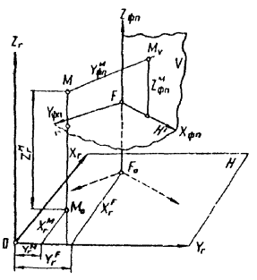 Примечание. Масштаб плана трассы 1:2000. Расстояние от исходной точки с известным пикетажом до определяемой измеряют циркулем-измерителем, а на местности - по поперечному масштабу. Аналогично выполняют и съемку поперечных профилей. При уточнении съемки поперечных профилей: - производят аналитическую укладку трассы, запроектированной на плане с учетом поперечных профилей; - определяют фотограмметрические координаты оси пути на поперечнике; - вычисляют углы δп, характеризующие ориентировку снимаемых поперечников в фотограмметрической системе координат. Съемку начинают с установки острия карандаша координатографа на точку оси трассы на планшете. Если отсчеты фотограмметрических координат X, Y не будут с точностью 0,02 мм равны предварительно вычисленным Xtг, Ytг, то марку перемещают штурвалами по оси X и Y до получения нужных отсчетов, после чего отсчитывают отметку H. Для съемки следующей точки профиля ассистент перемещает карандаш координатографа по направлению поперечника, показанному на плане трассы. Оператор останавливает ее на переломе профиля и сравнивает полученные координаты с предварительно вычисленными. При расхождениях более 0,02 мм марку переставляют движениями штурвала X и Y и делают новое приближение. Измеренные координаты точек поперечника записывают в ведомости и по ним затем вычисляют фотограмметрические координаты Yφп и Hп. Расстояние от оси трассы до точки поперечника вычисляют по формуле L = (Yt - Yφ)secδп. Поперечник строят в нужном масштабе по полученным расстояниям и отметкам. Составление фронтальных планов5.7. Для решения инженерно-геодезических задач по определению оптимального положения трассы и сооружений на круто-косогорных и обрывистых участках местности по материалам наземной стереофотосъемки в дополнение к топографическим планам, являющимся ортогональной проекцией местности на горизонтальную плоскость, целесообразно изготовлять фронтальные планы, где рельеф изображается фронталями, а элементы ситуации проектируются на вертикальную плоскость. Фронтальные планы составляют на участки территории со скалами, углы наклона которых достигают 45° и более. Плоскость проекции, в которой составляют фронтальный план, должны быть примерно параллельна направлению простирания склона. 5.8. Пространственное положение точек местности на фронтальном плане определяется абсциссой Xмφ.п, высотой Zмφ.п и отстоянием Yмφ.п от фронтальной плоскости проекции V (рис. 26). Рис. 26 Связь систем координат фронтального плана (F, Xφ.п, Yφ.п, Zφ.п) и геодезической системы координат OXYZ для точки M склона в соответствии с рис. 26 выражается следующими зависимостями: