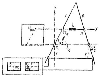 где B - значение базиса фотографирования, то положение точки M получим на планшете в масштабе плана t. Рис. 1 Конструктивное плановое положение точек определяется с помощью мостика и каретки отстояний, имеющей ролики M0 и N, по которым перемещаются линейки L и p. Каретка отстояний может перемещаться по направляющим x-x мостика отстояний, который в связи с чертежным устройством для фиксирования точки Mпл на планшете. Таким образом осуществляется засечка в плоскости X-Y для нормального случая съемки. Для решения задачи в случае равноотклоненных осей правый ролик N может перемещаться в базисных направляющих относительно левого, что соответствует разложению базиса по осям X и Y (BX и BY). При этом, если угол скоса осей равен φ, то BX = Bcosφ и BY = Bsinφ, где B - базис фотографирования в масштабе съемки. Для определения высот наблюдаемых точек стереоавтограф снабжен устройством, состоящим из двух жестко скрепленных под прямым углом линеек f и H (рис. 2), вращающихся вокруг точки S′1, соответствующей левому центру проектирования. Рис. 2 Короткая линейка с помощью