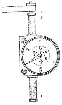 Для повышения точности определений отрезки сетки ΔX или ΔZ и разности отстояний ΔY следует выбирать по возможности большими. Рис. 4 Юстировку индикаторов плановых линеек производят в следующем порядке: - устанавливают каретку отстояний в дальнее положение (отсчет Y1 = 400 мм); - наводят марку на крайний правый штрих сетки (x1) и берут отсчет X1 по счетчику X; - наводят марку на левый крайний штрих сетки (x2) и берут отсчет X2; - перемещают каретку отстояний в ближнее положение (отсчет Y2 = 100 мм); - устанавливают марку на правый штрих сетки (x1) и берут отсчет X3; - устанавливают марку на левый штрих сетки (x2) и берут отсчет X4; - вычисляют разности ΔY = Y1 - Y2; ΔX1 = X1 - X2; ΔX2 = X3 - X4; ΔX = ΔX1 - ΔX2 и Δx = x1 - x2; - вычисляют фокусное расстояние f; - устанавливают индикатор на вычисленное значение f. Вид индикатора показан на рис. 5. Устанавливают его на вычисленное значение f вращение кольца с накаткой 3. Для этого ослабляют (вращение влево) кольцо с накаткой 2 и, вращая кольцо 3, устанавливают на индикаторе вычисленное значение f, после чего вновь закрепляют кольцо 2. Рис. 5 Юстировка индикаторов высотных линеек отличается только тем, что установки производят соответственно по крайнему верхнему Z1 и крайнему нижнему Z2 штрихам сетки, а отсчеты Z1, Z2, Z3 и Z4 берут по счетчику высот при установке на масштаб 1:1000 (цена деления счетчика 0,1 мм). Пример юстировки индикаторов Дальнее положение y1 = 400,00 мм X1 = 656,87 мм x1 = +80,00 мм X2 = 333,50 мм x2 = -80,00 мм ΔX1 = 323,37 мм Ближнее положение Y2 =100,00 мм X3 = 535,69 мм x1 = +80,00 мм X4 = 454,73 мм x2 = -80,00 мм ΔX2 = 80,96 мм ΔY = 300,00 мм ΔX = 242,41 мм Δx = 160,00 мм f = 198,01 мм Такие измерения с последующим вычислением фокусных расстояний производят для каждой линейки, после чего на всех индикаторах устанавливают одинаковое значение f, близкое к максимальному (например, 198,00 мм). Индикаторы базисных составляющих bX и bY Отсчеты по индикаторам базисных составляющих должны быть равны нулю, после того как плановые, а также высотные линейки установлены параллельно друг другу (при наведении марок на центральные кресты сеток). Юстировку производят в следующем порядке. 1. Смещают каретку отстояний в ближнее положение Y = 100, мм. 2. Устанавливают измерительную марку на центральный штрих сетки. 3. Вращают маховичок bX до тех пор, пока правая измерительная марка не совместится со средним вертикальным штрихом юстировочной сетки. 4. Устанавливают индикатор на отсчет bX = 0,00 мм. Установка выполняется так же, как и на индикаторах фокусных расстояний. 5. Проверяют юстировку; для этого каретку отстояний перемещают на весь диапазон до Ymax. При этом ни одна из двух измерительных марок не должна смещаться по направлению X. Юстировку индикатора bZ производят таким же образом. При этом измерительные марки совмещают с центральным горизонтальным штрихом сетки, а на индикаторе устанавливают отсчет bZ = 0,00 м. Индикаторы базисной составляющей bY При установках базисных составляющих bX = bY = bZ = 0 линейки в любом положении должны быть параллельны друг другу, а расстояния между точками вращения линеек и теми точками, в которых линейки соприкасаются с роликами каретки X или Z, равны друг другу и совпадать с показаниями счетчика Y. Согласно рис. 6, для плановых линеек в дальнем положении (отсчет Y1) получим: