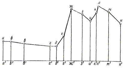 Продольный профиль (рис. 7) строится следующим образом. На прямой откладывают расстояния с плана трассы а′б′, б′в′ ... М′Н′, а в соответствующих точках превышения над проектной линией - взятые с вертикальной проекции рельефа.