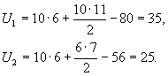 А.10 Вычисляют сумму рангов V1 (для комплекта 1) и V2 (для комплекта 2): V1 = 1 + 2 + 3 + ... + 16 = 80, V2 = 5 + 7 + 9 + 10 + 11 + 14 = 56. Вычисляют по формулам (16) и (17) значения величин: