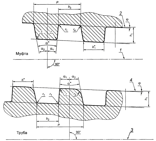 Если расчетное испытательное давление превышает 68,6 МПа (700 кгс/см2), труба испытывается давлением не более 68,6 МПа (700 кгс/см2). По требованию потребителя испытательное давление принимают равным расчетному, но в любом случае давление не должно быть свыше 122,6 МПа (1250 кгс/см2). По согласованию изготовителя с потребителем испытательное давление может ограничиваться значением: 19,7 МПа (200 кгс/см2) - для труб групп прочности Дс, Д, Кс, К; 29,4 МПа (300 кгс/см2) - для труб групп прочности Ес и выше. 4.23 Основные размеры соединений гладких труб с треугольной резьбой и муфт к ним приведены на рисунках 6 - 8 и в таблицах 11 - 14. ____________ * Размеры для справок. 1 - линия, параллельная оси резьбы трубы или муфты; 2 - линия среднего диаметра резьбы трубы или муфты; 3 - ось резьбы трубы или муфты Рисунок 6 - Форма профиля резьбы гладких труб и труб с высаженными наружу концами и муфт к ним ____________ * Размеры для справок. 1 - конец сбега резьбы трубы или муфты; 2 - нитки резьбы со срезанными вершинами; 3 - основная плоскость резьбы трубы или муфты; 4 - линия среднего диаметра резьбы трубы или муфты 1 - измерительная плоскость резьбового калибра-кольца; 2 - резьбовой калибр-кольцо; 3 - труба; 4 - резьбовой калибр-пробка; 5 - муфта; 6 - измерительная плоскость резьбового калибра-пробки Рисунок 8 - Схема определения натяга резьбы гладких труб и труб с высаженными наружу концами и муфт к ним Таблица 11 - Размеры резьбы гладких труб и труб с высаженными наружу концами и муфт к ним В миллиметрах