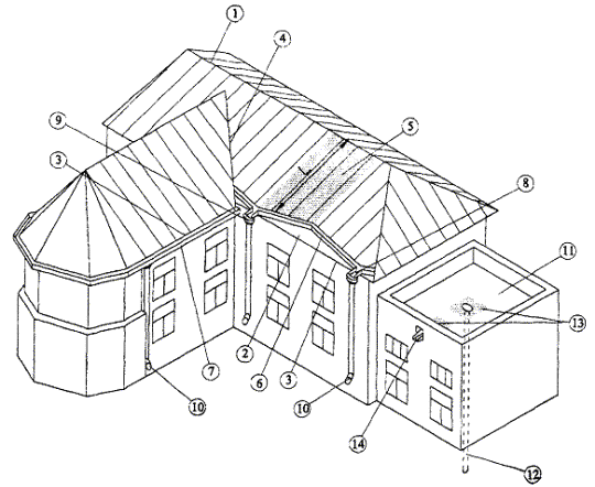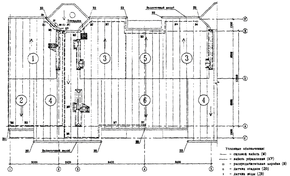 где Iпуск,i - пусковой ток для нагревательной секции Ni, А; Li - длина нагревательной секции N, м; К - коэффициент, зависящий от типа нагревательного кабеля и характеризующий его удельную мощность принимается по таблице 1. Таблица 1* * Данные предприятия-изготовителя нагревательных кабелей ООО «ССТ». 2. Для трехфазной силовой цепи сгруппировать полученные токи на три примерно равные части (для фаз А, В и С). Полученные цифры не должны отличаться друг от друга более чем на 15 % (в соответствии с требованиями ПУЭ). 3. По максимальной из трех цифр выбрать уставку защитного автомата с запасом до ближайшего стандартного значения 10 А, 16 A, 20 А, 25 А, 40 А или 63 А. Далее, с учетом системы автоматического управления, выбирается шкаф управления по каталогам фирмы-производителя. 4.2 Монтажная схема Монтажные схемы, как правило, выполняются на планах кровли и включают схемы раскладки нагревательных секций и разводки силовых кабелей и кабелей управления с обозначением основных габаритных размеров. На этой схеме помимо расположения самих нагревательных секций (СН) и их номера указываются распределительные коробки (В) и шкаф управления (ШУ), в котором обычно установлен терморегулятор. Схема разводки силовых кабелей (М) и кабелей управления (КУ) дополнительно содержит места установки распределительных коробок (В), датчиков температуры (ДТ), осадков (ДО) и воды (ДВ). Кроме вышеуказанных обозначений на схемах могут присутствовать и другие, например: концевые и соединительные муфты, монтажные концы, точка опуска. 4.3. Примеры монтажных схем для разных крыш Пример 1. Монтажная схема и методика расчета антиобледенительной системы для коттеджа с 4-х скатной крышей, расположенного в деревне Брикет (рис. 4.4, 4.5) Московской области *. * Монтажная схема выполнена ООО «ССТ». Расчет длины нагревательных секций Длина: лотков L = 41 м; водосточных труб L = 26 м; ендов L = 28 м; количество водосточных труб - 4 шт. Для проектирования антиобледенительной системы применяется саморегулирующийся кабель марки 23FSLe2-CT. 1. Расчет длины кабеля в лотке (желобе). Так как ширина обогреваемого лотка больше 50 мм, число ниток кабеля в лотке принимается равным 2. Для данного примера применяются секции с холодными концами длиной по 6 м: Lкa6 = 41 м ´ 1,05 ´ 2 = 86,1 м 2. Расчет длины кабеля в водосточных трубах. Так как диаметр обогреваемой трубы находится в пределах 100 - 150 мм, число ниток кабеля принимается равным 2. В данном случае труба непосредственно примыкает к лотку, также используются секции с холодными концами: Lкaб = (6 м ´ 1,05 ´ 2 + 1,5 м) ´ 4 шт. = 56,4 м. Рис. 4.4. Схема укладки нагревательных секций. Рис. 4.5. Схема разводки силовых кабелей и кабелей управления. 3. Расчет длины кабеля в ендовах. В общем случае ендовы достаточно обогревать на 1/3 их длины. В данном примере, с точки зрения удобства запитки нагревательных секций обогреваем ендовы на всю длину, применяются секции с холодными концами: Lкаб = 7 м ´ 1,05 ´ 4 шт. = 29,4 м 4. Суммарный расход кабеля. Lсумм = 86,1 м + 56,4 м + 29,4 м = 171,9 м Разбивка нагревательного кабеля на секции Для удобства раскладки секцию нагревательного кабеля целесообразнее начинать в месте примыкания водосточной трубы к лотку. В данном примере система разбита на 6 секций. Из них 4 секции по схеме: ендова-лоток-труба, т.е. секция проложена по лотку, далее в ендову, в ендове разворот, обратно по ендове, в лоток, в водосточную труб