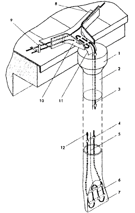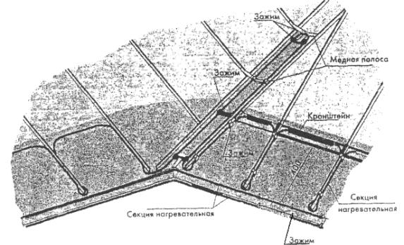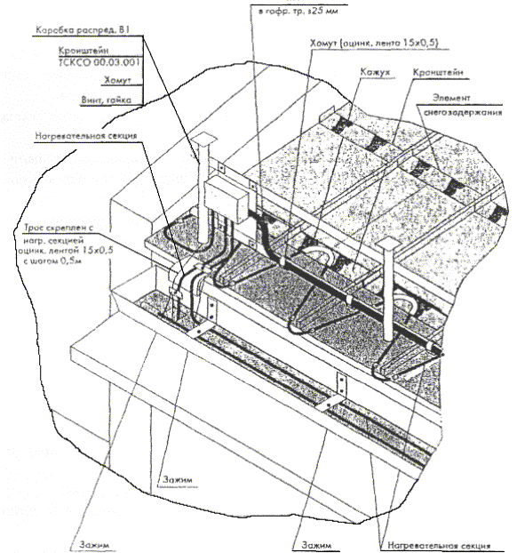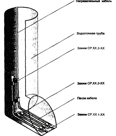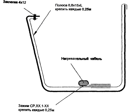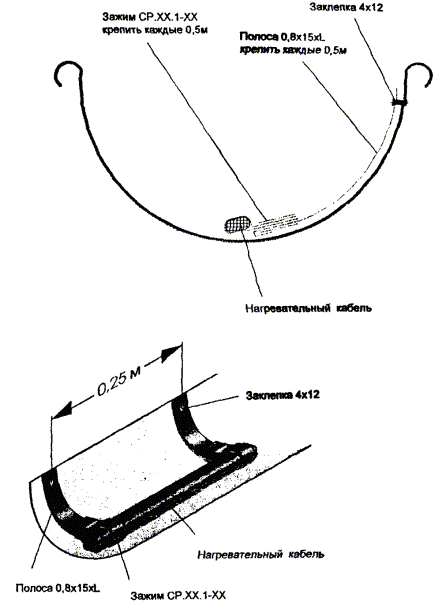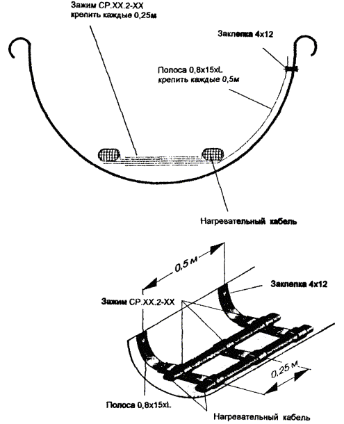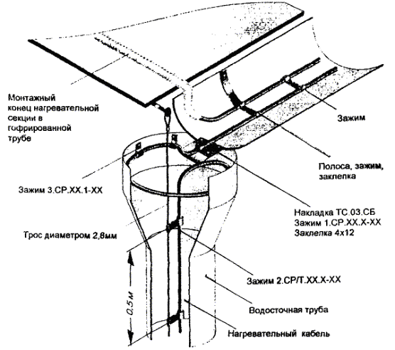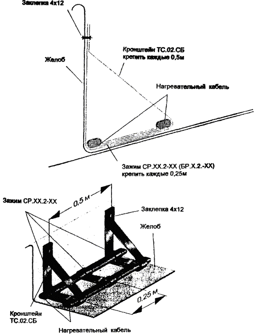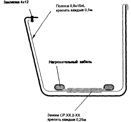 Рис. 5.4. Крепление двух ниток греющего кабеля в лотке. Рис. 5.5. Крепление двух ниток греющего кабеля в желобе. 5.8. Для крепления греющего кабеля в водосточной трубе часто используется подвеска его на металлическом тросе (рис. 5.6, 5.7), а в нижней части водосточной трубы для защиты от механических повреждений устанавливаются защитные кожуха. 5.9. Монтаж антиобледенительной системы на крыше с мягкой кровлей, выполненной из рулонных материалов (рубероида на битумной мастике, стеклобата, филизола и др.), отличается способом крепления элементов системы (кабелей, датчиков) непосредственно к кровле. При этом элементы системы раскладываются и закрепляются на специальной подложке, которая может быть изготовлена из металлической сетки, оцинкованного листа или из материала типа Поликров, закрепленных на кровле клей-мастикой. 5.10. Когда система полностью смонтирована, проверяется сопротивление изоляции секций нагревательных кабелей, минимальное сопротивление которой должно быть 10 МОм/м и прозваниваются тестером силовые и управляющие кабели. Результаты замеров оформляются типовым протоколом. При передаче системы в эксплуатацию с участием заказчика проводят пробное включение антиобледенительной системы в соответствии с инструкцией по ее эксплуатации. Включение производится, когда температура наружного воздуха находится в рабочем диапазоне, на который настроен терморегулятор. Система должна оставаться включенной не менее 1 часа, после чего следует замерить ток каждой секции. Автоматика системы проверяется либо при наличии осадков, либо поливкой водой датчиков воды и осадков. Согласно инструкции по эксплуатации терморегулятора его работоспособность проверяется путем выведения Тмин и Тмакс так, чтобы температура воздуха была вне этого диапазона. После чего снова установить требуемый рабочий диапазон температур терморегулятора. При положительном результате проверки работоспособности системы с участием заказчика составляется акт приемки-сдачи системы в эксплуатацию. Рис. 5.6. Крепление греющего кабеля в верхней части водосточной трубы. Рис. 5.7. Крепление греющего кабеля в нижней части водосточной трубы. 6. Основные положения по эксплуатации антиобледенительных систем6.1. Перед началом сезонной эксплуатации системы необходимо очистить кровлю и особенно участки, где расположены греющие кабели, воронки и водосточные трубы, а также датчики, от мусора и пыли мягкими щетками с водой. 6.2. Система включается обслуживающим персоналом при понижении температуры воздуха ниже -15 °С и выключается при устойчивом повышении температуры воздуха выше +5 °С, в промежутке между включением и выключением система работает в автоматическом режиме. 6.3. Для обеспечения нормальной эксплуатации системы необходимо раз в квартал осматривать и выполнять профилактику оборудования системы, в том числе. - подтяжку клеммных и винтовых электрических соединений; - контроль работы УЗО (устройство защитного отключения). Эти работы следует выполнять при полном снятии напряжения питания. Для проверки УЗО надо включить систему и нажать кнопку "Т" на корпусе УЗО, если УЗО выключится - оно исправно. В случае неисправности УЗО следует заменить. 6.4. Обслуживание системы должно осуществляться электриками, имеющими допуск на работы с электроустановками до 1000 В в соответств