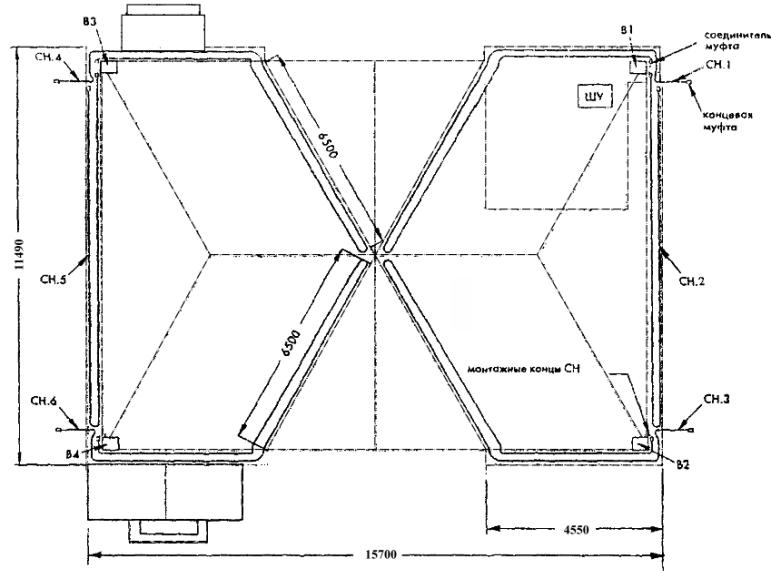 Рис. 4.7. Схема разводки силовых кабелей и кабелей управления секция № 1. Общие характеристики обогреваемых зон приведены ниже. Площадь обогреваемых зон на плоской кровле: S = 10,5 м2. Длина: - лотков L = 22,5 м; - водосточных труб L = 9,5 м; - ендов L = 12 м; - капельников L = 14 м; - количество водосточных труб - 6 шт.; - количество водосточных воронок - 7 шт.; - количество водомётов - 2 шт. Для проектирования антиобледенительной системы применяется саморегулирующийся кабель марки 23FSLe2-CT. 1. Расчет длины кабеля в лотке. Для лотков шириной до 50 мм (Lлотка = 6 м), число ниток кабеля в лотке принимается равным 1. В данном случае применяются секции без монтажных концов: Lкаб = 6 м ´ 1,05 + 1 м = 7,3 м Для лотков шириной более 50 мм (Lлотка = 16,5 м), число ниток кабеля в лотке принимается равным 2. В данном случае применяются секции без монтажных концов: Lка6 = 16,5 м ´ 1,05 ´ 2 + 1 м = 35,7 м 2 Расчет длины кабеля в водосточных трубах. Так как диаметр обогреваемых труб находится в пределах 100 - 150 мм, число ниток кабеля принимается равным 2. В данном случае трубы непосредственно примыкают к водометам, используются секции с холодными концами: Lкa6= 9,5м ´ 1,05 ´ 2 + 1,5 м ´ 2 = 23 м 3. Расчет длины кабеля в ендовах. В данном примере, с точки зрения удобства запитки нагревательных секций обогреваем ендовы на всю длину, применяются секции без монтажных концов: Lкаб = (6 м ´ 1,05 ´ 2 + 1 м) ´ 2 шт. = 27,2 м 4. Расчет длины кабеля на капельниках. При монтаже одна нитка кабеля крепится под капельник, вторая - вдоль края кровли, применяются секции с холодными концами: Lкаб = 16 м ´ 1,05 ´ 2 = 33,6 м 5. Расчет длины кабеля на плоских участках кровли вокруг воронок и водометов. При обогревe зон вокруг воронок и водометов кабель укладывается зигзагом с шагом 100 мм на площади примерно 1 м2, при этом нагревательная секция длиной около 1 - 2 м опускается во внутреннюю часть воронки. Применяются секции без монтажных концов: Lкаб = (13 м ´ 1,05 + 2 м + 1 м) ´ 8 шт. = 133,2 м 6. Суммарный расход кабеля. Lсумм = 7,3 м + 35,7 м + 23 м + 27,2 м + 33,6 м + 133,2 м = 260 м Разбивка нагревательного кабеля на секции Для снижения общего числа нагревательных секций целесообразно одной секцией обогревать несколько зон. В данном примере система разбита на 13 секций, которые приведены в таблице 3. Таблица 3