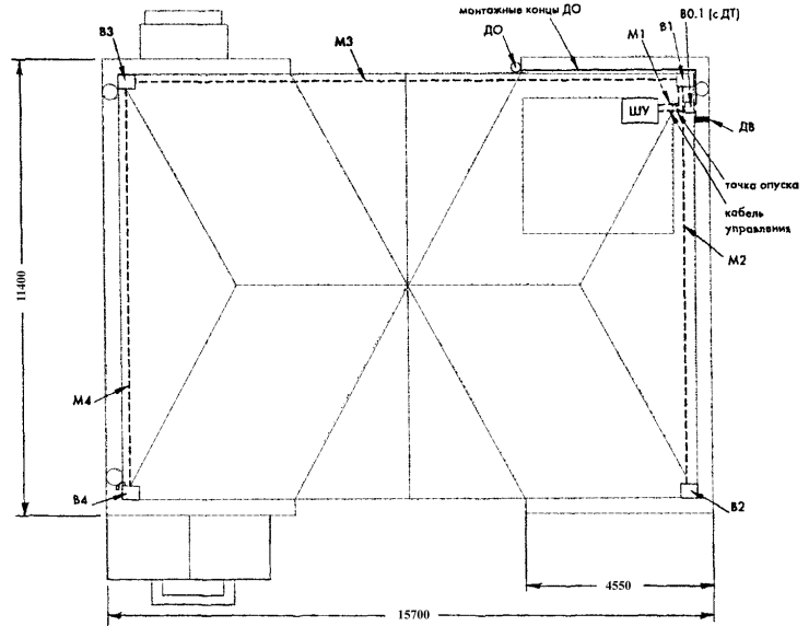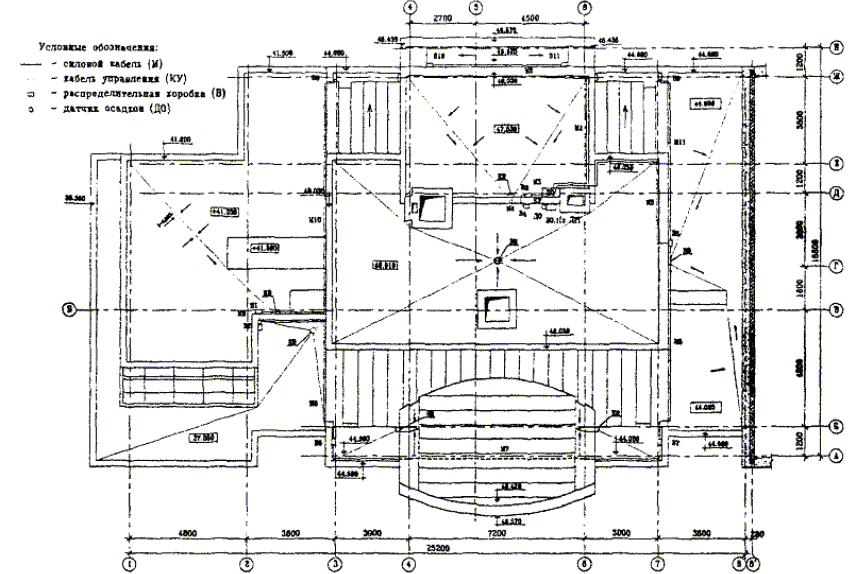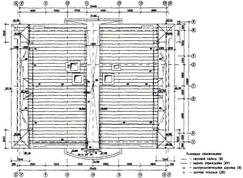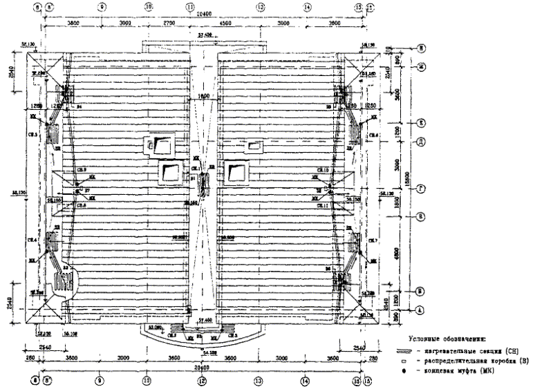 Рис. 4.14. Схема разводки силовых кабелей и кабелей управления на фрагменте кровли (зона 2). Общие характеристики обогреваемых зон приведены ниже. Длина: - лотков L = 43,1м; - водосточных труб L = 20,4 м; - примыкания к вертикальным стенам L = 41,8 м; - количество водосточных труб - 9 шт. Для проектирования противообледенительной системы применяется саморегулирующийся кабель марки 31FSR2-CT. 1. Расчет длины кабеля в лотке. Для лотков шириной до 200 мм (Lлотка = 43,1 м) число ниток кабеля в лотке принимается равным 2. В данном случае применяются секции с монтажными концами: Lкаб = 43,1 м ´ 1,05 ´ 2 = 90,5 м 2. Расчет длины кабеля в водосточных трубах. Так как диаметр обогреваемых труб находится в пределах 100 - 150 мм, число ниток кабеля принимается равным 1. В данном случае трубы непосредственно примыкают к желобам, используются секции с холодными концами: Lкa6 = (20,4 м ´ 1,05 + 1,5 м) ´ 9 = 206,2 м 3. Расчет длины кабеля в местах примыкания к вертикальным стенам. В данном примере, с точки зрения удобства запитки нагревательных секций обогреваем примыкания на 1/3 длины, применяются секции с монтажными концами: Lкаб = 41,8 м ´ 1,05 ´ 2 ´ 1/3 = 29,3м 4. Суммарный расход кабеля. Lсумм = 90,5 м + 206,2 м + 29,3 м = 326 м Разбивка нагревательного кабеля на секции Для снижения общего числа нагревательных секций целесообразно одной секцией обогревать несколько зон. В данном примере система разбита на 9 секций, которые приведены в таблице 6. Таблица 6