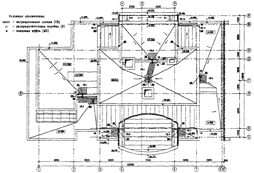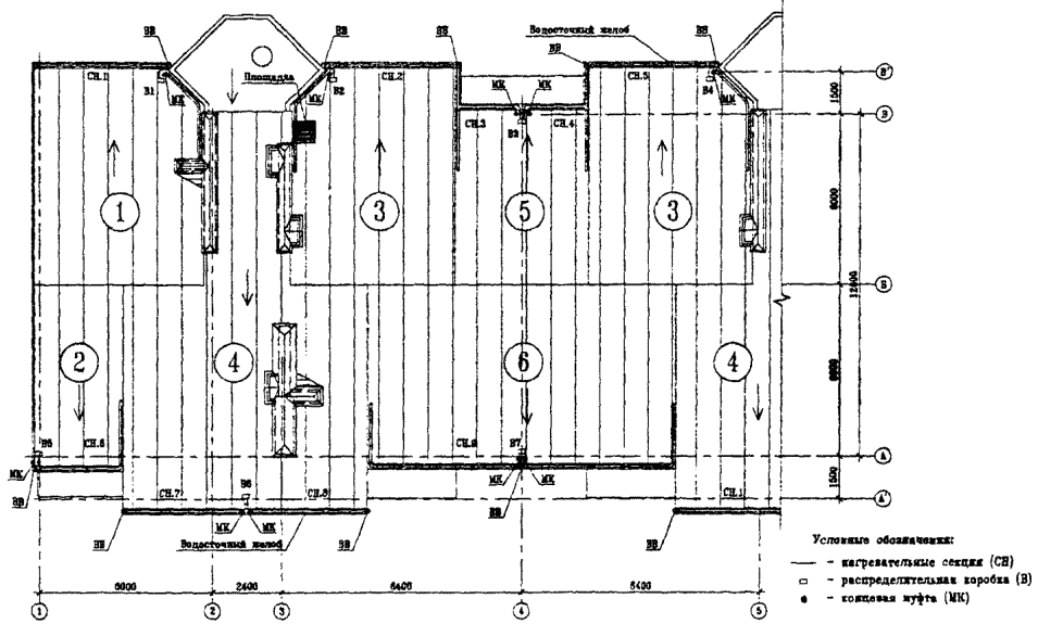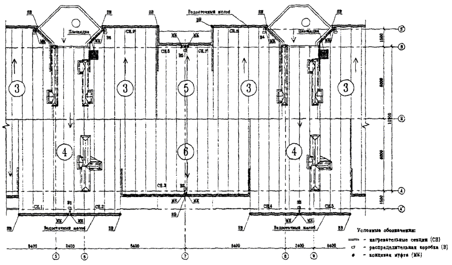 Выбор шкафов управления Производится расчет пусковых токов для каждой нагревательной секции, указанной в таблице: Iпуск, 1 = L1 ´ К / 220 = 31 ´ 60 / 220 = 8,46 А, Iпуск, 2 = L2 ´ К / 220 = 24 ´ 60 / 220 = 6,55 А, Iпуск,. 3 = L3 ´ К / 220 = 31 ´ 60 / 220 = 8,46 А, Iпуск, 4 = L4 ´ К / 220 = 31 ´ 60 / 220 = 8,46 А, Iпуск, 5 = L5 ´ К / 220 = 24 ´ 60 / 220 = 6,55 А, Iпуск, 6 = L6 ´ К / 220 = 31 ´ 60 / 220 = 8,46 А. В случае, если Iпуск > 32 А, группируем 3 фазы. Далее разбиваем полученные цифры на три примерно равные части. Получаем: для фазы А: 8,46 + 8,46 = 16,92 А; для фазы В: 8,46 + 6,55 = 15,01 А; для фазы С: 8,46 + 6,55 = 15,01 А. Разница между максимально нагруженной (16,92 А) и минимально нагруженной (15,01 А) фазами составляет около 11 %, что соответствует требованиям ПУЭ. По максимально нагруженной фазе выбираем уставку защитного автомата с запасом. Пусковой ток составляет 17 А, следовательно, уставка защитного автомата - 20 А. Далее, с учетом системы автоматического управления, выбираем шкаф управления: ШУ-ТС-3-25-200, где ШУ - шкаф управления; ТС - фирма-изготовитель; 3 - для трехфазной разводки; 25 - максимально допустимый ток на одну фазу А; 200 - тип используемого регулятора температуры - РТ200Е. Рабочая мощность - 4 кВт. Установленная мощность - 7 кВт. Расчет количества крепежных элементов В данном случае лотки и водосточные трубы изготовлены из оцинкованной стали, покрытой полимерным материалом (пластизолом), поэтому применяются крепежные элементы из оцинкованной стали. 1. Крепежные элементы для лотков. Общая длина обогреваемых лотков - 41 м. Ширина лотков - 100 мм. Зажим СР.23.2-50 - 41 ´ 4 + 10 % = 180 шт. Полоса 0,8 ´ 15 ´ 200 мм - (41 ´ 2 + 10 %) ´ 0,2 м = 18 м. Заклепки отрывные из оцинкованной стали 4 ´ 12 - 41 ´ 2 + 10 % = 90 шт. 2. Крепежные элементы для водосточных труб. Количество обогреваемых водосточных труб - 4 шт. Длина водосточных труб - до 10 м. Диаметр водосточных труб - 100 мм. Т-скоба - 4 шт. Зажим CP.23.1-25 - 4 ´ 3 + 10 % = 13 шт. Зажим СР.23.2-50 - 4 ´ 10 + 10 % = 44 шт. Заклепки отрывные из оцинкованной стали 4 ´ 12 - 4 ´ 3 + 4 ´ 4 + 10 % = 31 шт. Кожух ТС.05/К.100 - 4 шт. 3. Крепежные элементы для ендов. Общая длина обогреваемых ендов - 26 м. Зажим CР/T.23.2-50 - 26 ´ 2 + 10 % = 58 шт. Трос стальной Æ = 2,8 мм - 26 + 10 % = 29 м. Пример 2. Для иллюстрации возможного решения антиобледенительной системы для сложной крыши, расположенной в разных уровнях и состоящей из скатных и плоских участков, взят трехсекционный 12 - 17 этажный жилой дом, разработанный ЦНИИЭП жилища и расположенный по адресу ул. Карамышевская наб. кв-л 74 вл. 20 - 24. Расчет антиобледенительной системы выполняется отдельно для каждой секции. Секции № 1 и № 3 зеркально симметричны, поэтому расчет приводится только для секции № 1. Расчет длины нагревательных кабелей для секции № 1 Кровля секции № 1 (рис. 4.6, 4.7) имеет как скатные, так и плоские участки с внутренним водостоком. Отвод воды со скатных участков организован при помощи водосточных желобов в воронки внутреннего водостока (ВВ). Кроме того, отдельные участки плоской кровли не имеют собственных воронок внутреннего водостока, и вода удаляется на нижние уровни при помощи водометов и водосточных труб. Соответственно обогрев плоских частей кровли осуществляется вокруг водометов, воронок и зон перед водосточными трубами площадью около 1 м и т.п., то есть по всему пути удаления воды. Рис. 4.6. Схема установки нагревательных секций на кровле секции № 1.
