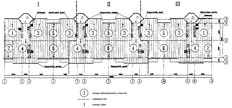 Выбор шкафов управления Производится расчет пусковых токов для каждой нагревательной секции, указанной в таблице: Iпуск, 1 = L1 ´ К / 220 = 15 ´ 60 / 220 = 4,09 А, Iпуск, 2 = L2 ´ К / 220 = 9 ´ 60 / 220 = 2,45 А, Iпуск, 3 = L3 ´ К / 220 = 9 ´ 60 / 220 = 2,45 А, Iпуск, 4 = L4 ´ К / 220 = 32 ´ 60 / 220 = 8,73 А, Iпуск, 5 = L5 ´ К / 220 = 32 ´ 60 / 220 = 8,73 А, Iпуск, 6 = L6 ´ К / 220 = 32 ´ 60 / 220 = 8,73 А, Iпуск, 7 = L7 ´ К / 220 = 32 ´ 60 / 220 = 8,73 А, Iпуск, 8 = L8 ´ К / 220 = 35 ´ 60 / 220 = 9,55 А, Iпуск, 9 = L9 ´ К / 220 = 35 ´ 60 / 220 = 9,55 А, Iпуск, 10 = L10 ´ К / 220 = 35 ´ 60 / 220 = 9,55 А, Iпуск, 11 = L11 ´ К / 220 = 35 ´ 60 / 220 = 9,55 А. Так как Iпуск > 32А, группируем 3 фазы. Далее разбиваем полученные цифры на три примерно равные части. Получаем: для фазы А: 4,09 + - 2,45 + - 2,45 + 8,73 + 9,55 = 27,27 А; для фазы В: 8,73 + 8,73 + 9,55 = 27,01 А; для фазы С: 8,73 + 9,55 + 9,55 = 27,83 А. Разница между максимально нагруженной (27,83 А) и минимально нагруженной (27,01 А) фазами составляет около 3 %, что соответствует требованиям ПУЭ. По максимально нагруженной фазе выбираем уставку защитного автомата с запасом. Пусковой ток составляет 28 А, следовательно, уставка защитного автомата - 40 А. С учетом системы автоматического управления, выбираем шкаф управления: ШУ-ТС-3-40-200 с регулятором РТ200Е. Рабочая мощность на секцию № 2: Рном = Lсумм ´ 23 = 301 ´ 23 = 7 кВт. Установленная мощность на секцию № 2: Руст = К ´ Рном = 2 ´ 7 = 14 кВт. Расчет количества крепежных элементов В данном случае лотки и водосточные трубы изготовлены из оцинкованной стали, покрытой полимерным материалом (пластизолом), поэтому применяются крепежные элементы из оцинкованной стали. 1. Крепежные элементы для желобов. Общая длина обогреваемых лотков - 36 м. Зажим СР.23.2-50 - 36 ´ 4 + 10 % = 159 шт. Кронштейн ТС.02.СБ - 36 ´ 2 ´ 10 % = 80 шт. Заклепки отрывные из оцинкованной стали 4 ´ 12 - 36 ´ 2 + 10 % = 80 шт. 2. Крепежные элементы для водосточных труб. Количество обогреваемых водосточных труб - 4 шт. Длина водосточных труб - до 10 м. Диаметр водосточных труб - 100 мм. Накладка ТС.ОЗ.СБ - 4 шт. Зажим СР.23.1 - 25 - 4 ´ 4 + 10 % = 18 шт. Зажим СР.23.2-50 - 4 ´ 10 + 10 % = 44 шт. Заклепки отрывные из оцинкованной стали 4 ´ 12 - (4 ´ 4 + 4 ´ 4) ´ 1,1 = 36 шт. Кожух ТС.05/К.100 - 4 шт. 3. Крепежные элементы для мягкой кровли. Общая площадь обогреваемых зон - 11 м2. Зажим СР.23.1-25 - 7 ´ 3 + 10 % = 23 шт. Зажим СР.23.2-50 - 11 ´ 15 + 10 % = 182 шт. Скоба-полоса 0,5 ´ 15 ´ 250 мм - (11 ´ 15 + 10 %) ´ 0,25 м = 45,4 м. Скоба ТС.03.СБ - 7 шт. Заклепки отрывные из оцинкованной стали 4 ´ 12 - (11 ´ 15 + 11 ´ 4) ´ 1,1 - 230 = шт. Поликров АР-130 - 11 м2 + 10 % = 12,1 м2. 12,1 м2 ´ 0,9 кг/м2 = 10,9 кг. Клей-мастика М140 (МР1). Рабочая мощность на всё здание: Рном = 6 + 7 + 6= 19 кВт Установленная мощность на всё здание: Руст = 12 + 14 + 12 = 38 кВт Пример 3. Разработка антиобледенительной системы для реконструируемого четырехсекционного пятиэтажного жилого дома серии 1-511 по проекту ЦНИИЭП жилища. Проектом реконструкции предусматривается надстройка двух этажей, причем последний этаж - мансардного типа. Кровля - скатная с наружным водостоком. Материал кровли - металлочерепица. При расчете антиобледенительной системы кровля разбивается на отдельные участки, соответствующие отдельным плоскостям. Некоторые участки повторяются и на них можно разместить одинаковые нагревательные элементы. При этом один и тот же участок может располагаться на соседних секциях здания. Вся кровля разделена на три зоны (рис. 4.10). Расчет антиобледенительной системы выполняется отдельно для каждой зоны. Зоны № 1 и № 3 зеркально симметричны, поэтому расчет приводится только для зоны № 1. Расчет длины нагревательных кабелей для зоны № 1. Кровля зоны № 1 (