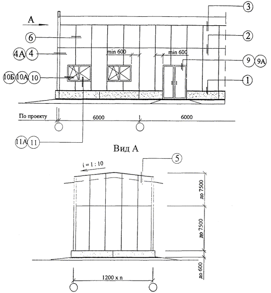 1. Панель 2. Диффузионная лента ГПЛ 3. Самосверлящий винт IR2-4,8 ´ 60, шаг 600 4. Самосверлящий винт SL2-T-A14-4,8 ´ 20 или заклепки ATO-D-4,8 ´ 6*, шаг 300 5. Теплоизоляция из минваты 6. Индивидуальный доборный элемент 0,7...1,2 мм оцинкованный с полимерным покрытием 7. Скоба оцинк. 70 ´ 1,2 мм, 2 шт. по высоте 8. Самосверлящий шуруп SW-T-A14-4,8 ´ 35, шаг 300 9. Оконный блок 10. Изоляционная лента ПУЛ 11. Самосверлящий винт SD * Только внутри помещения Узел 10А. Крепление оконного блока на примере алюминиевых профилей ООО "Алюмстройтех" (холодное окно)