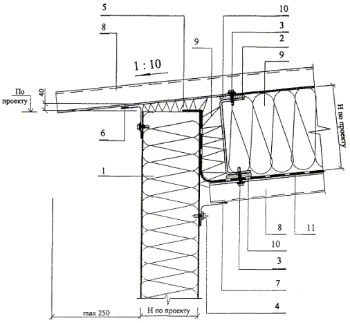 1. Панель 2. Прогоны кровли 3. Самосверлящий винт SD*, в каждой волне 4. Самосверлящий винт SL2-T-A14-4,8 ´ 20 или заклепки АТО-4,8 ´ 6**, шаг 300 5. Теплоизоляция из минваты 6., 7. Индивидуальный доборный элемент 1,2 мм оцинкованный с полимерным покрытием 8. Профнастил по проекту 9. Минвата по проекту 10. Прокладка из фанеры 14 мм 11. Полиэтиленовая пленка * Номенклатуру крепежных элементов см. в таблице 4 докум. - ПЗ и рекомендации по применению на листе 19 данного документа ** Только внутри помещений Узел 4. Угол стены при стальном каркасе