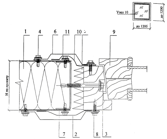 1. Панель 2. Лента Абрис С-ЛБ 15 ´ 5 2*. Лента Абрис С-ЛБ 15 ´ 2 3. Самосверлящий винт SL2-T-A14-4,8´20 или заклепки АТО-4,8 ´ 6**, шаг 300 4. Дюбель-гвоздь ДГ или анкер пружинный Spike D-4,8 ´ 51 5. Гнутый оцинкованный профиль 0,6 мм с полимерным покрытием 6. Шуруп, шаг 600 7. Гнутый оцинкованный профиль 0,6 мм с полимерным покрытием 8. Полоса оцинков. 150 ´ 1,5 мм, шаг 500 9. Пробка деревянная, шаг 600 10. Теплоизоляция из минваты 11. Доска антисептированная * Номенклатуру крепежных элементов см. в таблице 4 докум. - ПЗ и рекомендации по применению на листе 19 данного документа ** Только внутри помещения Узел 8. Крепление к рядовой колонне.Горизонтальная разрезка фасада.