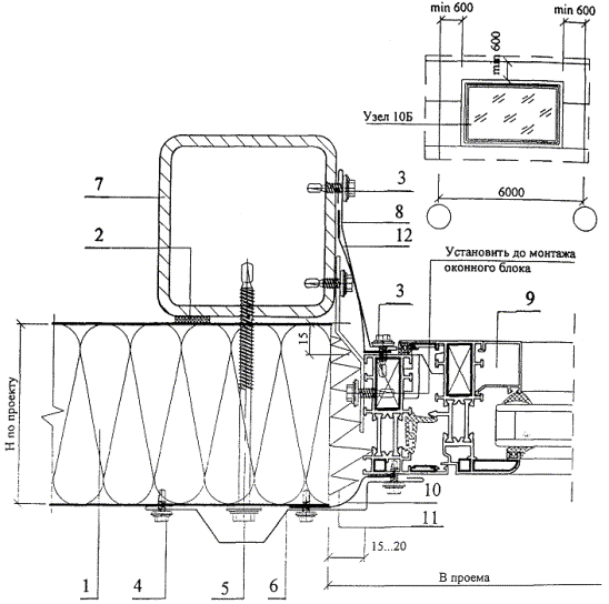 1. Панель 2. Лента Абрис С-ЛБ 15 ´ 5 3. Самосверлящий винт SD, шаг 600 4. Самосверлящий винт SL2-T-A14-4,8 ´ 20, шаг 300 5. Самосверлящий винт SDT, шаг 400 6. Индивидуальный доборный элемент 0,6 мм оцинкованный с полимерным покрытием 7. Стальной элемент конструкции 8. Индивидуальный доборный элемент 0,6 мм оцинкованный с полимерным покрытием 9. Оконный блок 10. Диффузионная лента ГПЛ 11. Теплоизоляция из минваты 12. Изоляционная лента ПУЛ Узел 10Б. Крепление оконного блока на примере алюминиевых профилей ООО "Алюмстройтех" (теплое окно)
