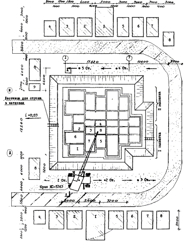 1.3. Работы по монтажу скользящей опалубки производить в дневное время суток. 1.4. При привязке технологической карты к конкретному объекту и условиям строительства в порядок монтажа скользящей опалубки, принятый в карте, вносят коррективы, обусловленные схемой здания, а также уточняют объемы работ, калькуляцию трудовых затрат, график производства работ, технико-экономические показатели. Организация строительной площадки будет меняться в зависимости от этажности и глубины заложения фундамента. При возведении в зимний период необходимо заготовить брезент для тепляка, пленку или рубероид для окон, теплогенераторы. 2. ОРГАНИЗАЦИЯ И ТЕХНОЛОГИЯ СТРОИТЕЛЬНОГО ПРОЦЕССА2.1. До начала монтажа скользящей опалубки необходимо выполнить следующие работы: оборудовать строительную площадку бытовыми помещениями, подвести электроэнергию и воду; завезти на строительную площадку согласно рабочим чертежам все необходимые материалы, элементы скользящей опалубки, гидро- и электрооборудование; разбить и закрепить оси на фундаментной плите несмываемой краской; определить наивысшую точку фундаментной плиты, а затем отметку нижней кромки щитов опалубки, которая должна быть на 2 - 3 см выше самой высокой отметки плиты; составить исполнительную схему фундаментной плиты; получить и освидетельствовать металлические щиты опалубки, домкратные рамы, гидрооборудование, элементы рабочего пола, козырька и подвесных подмостей; на площадке складирования рассортировать и разложить щиты опалубки по типоразмерам. 2.2. Элементы скользящей опалубки и гидрооборудование монтируют при помощи пневмоколесного крана КС-5363, который должен работать на спланированном и уплотненном основании, засыпанном щебнем (рис. 1, 2). Перед монтажом щитов опалубки их очищают от налипшего бетона, при необходимости рихтуют и исправляют обнаруженные повреждения, рабочую поверхность смазывают эмульсолом. Монтаж элементов опалубки начинают со сборки внутренних коробов, которую выполняют на фундаментной плите или стенде-кондукторе, расположенном рядом со строящимся зданием. При сборке коробов на фундаментной плите наклон стенок опалубки проверяют шаблоном с отвесом. Собранные внутренние короба монтируют в определенной последовательности (рис. 3). Монтируют внутренний короб, вяжут арматуру, устанавливают закладные детали, временные деревянные коробки согласно рабочим чертежам, затем монтируют следующий короб и т.д. Собранные короба раскрепляют временными связями для предотвращения случайных смещений. В качестве связей применяют обрезки арматурной стали, прихваченные к верхнему уголку щитов электросваркой. Рис. 1. Схема организации работ при монтаже скользящей опалубки: 1 - площадка сборки щитов в короба 80 м2; 2 - площадка складирования линейных щитов 40 м2; 3 - площадка складирования внутренних угловых щитов 40 м2; 4 - площадка складирования наружных угловых щитов 23 м2; 5 - площадка складирования домкратных стержней 35 м2; 6 - площадка складирования пиломатериалов 30 м2; 7 - площадка складирования металлоконструкций (рабочего пола, козырька, подвесных подмостей) 30 м2; 8 - площадка складирования арматуры 53 м2; 9 - площадка складирования временных деревянных коробок 6 м2. Условные обозначения: