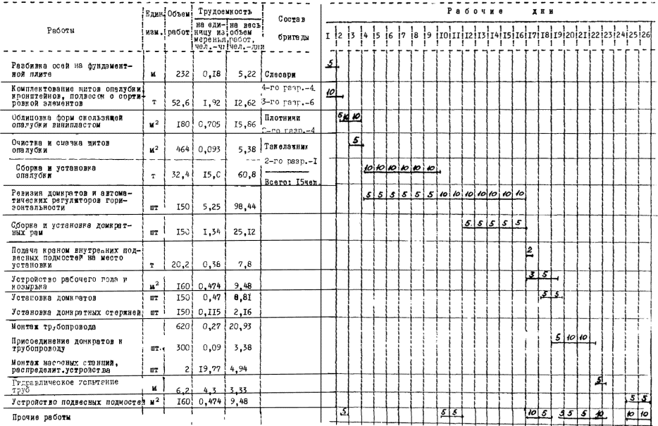 3. ТЕХНИКО-ЭКОНОМИЧЕСКИЕ ПОКАЗАТЕЛИЗатраты труда на монтаж скользящей опалубки, чел.-дней 340,71 Затраты машино-смен работы крана 17 Выработка на одного рабочего в смену, т 0,15 Стоимость затрат труда, руб.-коп. 1626-69 Затраты труда на монтаж 1 т опалубки, чел.-дней 6,47 4. МАТЕРИАЛЬНО-ТЕХНИЧЕСКИЕ РЕСУРСЫ4.1. Потребность в конструкциях и полуфабрикатах Таблица 5