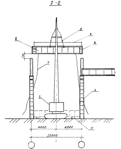 1 - кран монтажный; 2 - блок подкрановых балок; 3 - грузозахватное приспособление; 4 - лестница приставная; 5 - деревянная подкладка; 6 - направление движения крана; 7 - оттяжка; 8 - лестница подвесная; 9 - страховочный канат