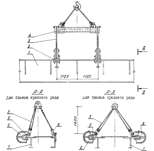1 - блок подкрановых балок; 2 - захват; 3 - строп; 4 - распорка; 5 - штырь; 6 - крюк. |