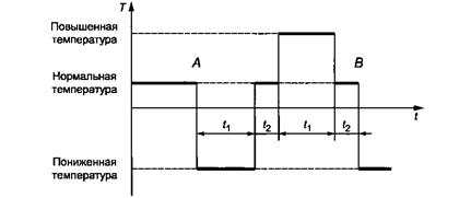 Т - температура в камере; t - текущее время; А - начало цикла; В - окончание цикла; t1 - время выдержки; t2 - время переноса Рисунок 1 - График испытательного цикла 8.9.4 График испытательного цикла приведен на рисунке 1. 8.9.5 Время переноса t2 должно быть не более 0,02 времени достижения теплового равновесия, указанного в 8.7.5. 8.9.6 После окончания последнего цикла испытания монитор извлекают из камеры, выдерживают в нормальных климатических условиях (8.1.1) до достижения теплового равновесия, затем проводят осмотр внешнего вида монитора и контроль его характеристик в соответствии с 8.1.9 - 8.1.13. 8.9.7 Оценка результатов испытания - по 8.1.17. 8.9.8 При наличии в ТУ требований к устойчивости метод испытаний должен быть приведен в ТУ на мониторы конкретного типа. 8.10 Испытание на воздействие атмосферного пониженного давления (5.1.3.3)8.10.1 Испытание проводят для проверки работоспособности монитора при и после воздействия атмосферного пониженного давления. 8.10.2 Испытанию на воздействие атмосферного пониженного давления подвергают мониторы группы исполнения Р2. Мониторы группы исполнения Р1 данному испытанию не подвергают. 8.10.3 Монитор помещают в барокамеру, в которой установлены нормальные климатические условия испытания (8.1.1), проводят осмотр внешнего вида монитора и контроль его характеристик в соответствии с 8.1.9 - 8.1.13. 8.10.4 Давление в камере понижают до 66 кПа со скоростью не более 10 кПа/мин. Монитор выдерживают при этом давлении в течение часа, после чего проводят контроль его характеристик в соответствии с 8.1.11 - 8.1.13. 8.10.5 Затем давление в барокамере повышают до нормального (8.1.1) со скоростью не более 10 кПа/мин. Монитор может оставаться во включенном состоянии в течение всего времени изменения давления. 8.10.6 После выдержки монитора в нормальных климатических условиях в течение часа проводят осмотр внешнего вида монитора и контроль его характеристик по 8.1.9 - 8.1.13. 8.10.7 Оценка результатов испытания - по 8.1.17. 8.11 Испытания на воздействие вибрационных и ударных нагрузок, соответствующих рабочим условиям (5.1.3.4 - 5.1.3.7)8.11.1 Испытания проводят в следующей последовательности: - испытание по определению резонансных частот; - испытание на устойчивость к воздействию синусоидальной вибрации (испытание на виброустойчивость); - испытание на прочность к воздействию синусоидальной вибрации (испытание на вибропрочность); - испытание на прочность к воздействию механических ударов многократного или одиночного действия (испытание на ударную прочность); - испытание на устойчивость к воздействию механических ударов многократного действия (испытание на ударную устойчивость). Необходимость проведения отдельных видов испытаний устанавливают в стандартах и (или) ТУ на мониторы конкретного типа в зависимости от предъявляемых к ним требований. 8.11.2 Испытания проводят в нормальных климатических условиях испытаний (8.1.1). 8.11.3 Требования к креплению монитора для проведения механических испытаний и к контрольным точкам, в которых устанавливаются параметры испытательных режимов, - по 1.51 - 1.54 ГОСТ 20.57.406-81. 8.11.4 Испытание по определению резонансных частот (5.1.3.5) 8.11.4.1 Испытание проводят с целью проверки механических свойств мониторов и получения исходной информации для выбора методов испытаний на виброустойчивость, вибропрочность, а также для выбора длительности действия ударного ускорения при