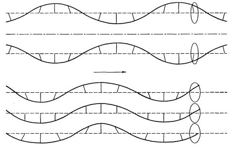 Рис. 2. Деформации пластины при распространении симметричных и антисимметричных волн Лэмба 4.3.2.17. Антисимметричная волна Лэмба (Antisymmetrical Lamb wave) - мода волны Лэмба, в которой частицы среды колеблются антисимметрично относительно нейтральной (средней) зоны пластины: вертикальные проекции смещения частиц равны, а продольные проекции - противоположны по знаку, причем в нейтральной зоне частицы совершают только поперечные колебания. 4.3.2.18. Волна Лэмба нулевого порядка (Lamb wave of zero order) - симметричная и антисимметричная моды волн Лэмба, возбуждаемые в широком диапазоне произведения толщины слоя h на частоту f, начиная от hf=0. 4.3.2.19. Изгибная волна (Bending wave, flexural wave) - волна, создающая деформацию изгиба, распространяющаяся в стержнях и слоях. Для листов - частный случай антисимметричной волны Лэмба нулевого порядка при малых значениях произведения толщины слоя на частоту. 4.3.2.20. Продольная волна в стержне (Longitudinal wave in a rod) - продольная волна в стержне, поперечный размер которого много меньше длины волны. Скорость распространения этой волны определяется только модулем нормальной упругости Е и плотностью материала ρ: