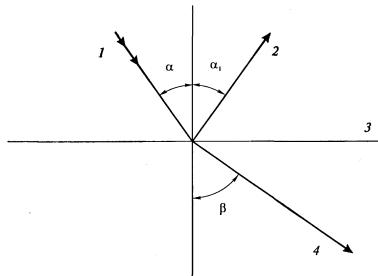 Рис. 3. Отражение и преломление волн на границе раздела сред: 1 - падающая волна; 2 - отраженная волна; 3 - граница раздела сред; 4 - преломленная волна; a - угол падения; a1 - угол отражения; b - угол преломления 4.3.4.3. Угол падения (Angle of incidence): 1. Угол между лучом падающей волны и нормалью к поверхности раздела сред. 2. Угол между акустической осью падающего пучка и нормалью к поверхности раздела сред [10]. 4.3.4.4. Нормальное падение (Normal incidence) - падение волны на поверхность раздела сред, при котором луч падающей волны параллелен нормали к этой поверхности. 4.3.4.5. Наклонное падение (Angular incidence) - падение волны на поверхность раздела сред, при котором луч падающей волны не параллелен нормали к этой поверхности. 4.3.4.6. Отражение (Reflection, wave reflection): 1. Изменение направления распространения упругой волны в результате ее взаимодействия с границей раздела или неоднородностью среды, не связанное с переходом через эту границу. 2. Изменение направления распространения упругой волны в среде в результате взаимодействия с границей раздела или неоднородностью среды. При отражении возможна также трансформация волн [10]. 4.3.4.7. Отраженная волна (Reflected wave) - волна, распространяющаяся в той же среде, что и падающая, после взаимодействия последней с границей раздела или неоднородностью среды. 4.3.4.8. Многократные отражения (Multiple reflections, multiple echo) - неоднократные отражения акустических импульсов между двумя или большим количеством границ раздела или неоднородностями [10]. 4.3.4.9. Реверберация (Reverberation) - явление многократного отражения акустических импульсов в ограниченном объеме. 4.3.4.10. Угол отражения (Angle of reflection) - угол между нормалью к границе раздела сред и лучом отраженной волны. Единица измерения градус. 4.3.4.11. Коэффициент отражения по амплитуде, коэффициент отражения (Reflection coefficient): 1. Отношение амплитуды отраженной волны к амплитуде падающей волны у границы раздела сред. 2. Отношение общего звукового давления отраженной волны к звуковому давлению падающей волны у границы раздела сред [10]. 4.3.4.12. Коэффициент отражения по энергии (Energy reflection coefficient) - отношение энергии отраженной волны к энергии падающей волны у границы раздела сред. 4.3.4.13. Полное отражение (Total reflection): 1. Отражение, при котором отраженная волна имеет тот же тип, что и падающая, а модуль коэффициента отражения равен единице. 2. Отражение, происходящее при угле падения, превышающем критические углы, или при коэффициенте отражения, равном единице [10]. 4.3.4.14. Преломление (Refraction) - изменение направления распространения волны при переходе через границу раздела сред с разными скоростями распространения волн [10]. 4.3.4.15. Преломленная волна (Refracted wave) - волна, изменившая свое направление при прохождении через границу раздела сред [10]. При преломлении возможна также трансформация волн. 4.3.4.16. Угол преломления (Angle of refraction): 1. Угол между лучом преломленной волны и нормалью к границе раздела сред. 2. Угол между акустической осью преломленного пучка и нормалью к границе раздела сред [10]. 4.3.4.17. Показатель преломления (Refractive index): 1. Отношение скорости падающей волны к скорости преломленной волны. 2. Отношение скоростей звука в двух средах [10]. 4.3.4.18. Коэффициент прохождения по амплитуде, коэффициент прозрачности (Transmission coefficient): 1. Отношение амплитуды волны, прошедшей через границу раздела сред, к амплитуде падающей волны у этой границы. Примечание. Ко