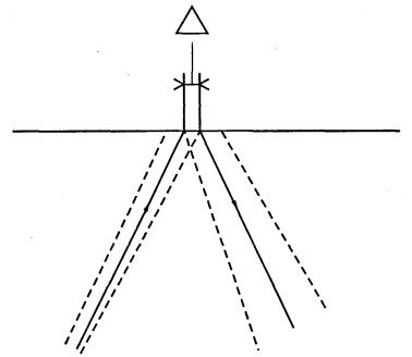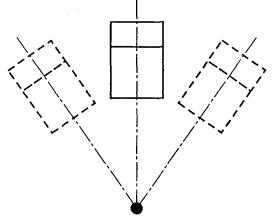 Рис. 16. Сканирование с поворотом 4.12.1.10. Спиральное сканирование (Spiral scanning) - сканирование путем линейного перемещения с одновременным вращением цилиндрического объекта контроля (трубы) или преобразователя [10]. 4.12.1.11. Направление сканирования (Scanning direction) - направление перемещения преобразователя (или точки ввода) по поверхности объекта контроля [10]. 4.12.1.12. Ручное сканирование (Manual scanning) - ручное перемещение преобразователя по поверхности объекта контроля [10]. 4.12.1.13. Автоматическое сканирование (Automatic scanning): 1. Автоматическое взаимное перемещение преобразователя и объекта контроля. 2. Автоматическое перемещение преобразователя по поверхности объекта контроля [10]. 4.12.1.14. Шаг сканирования (Scanning index) - расстояние между соседними траекториями перемещения преобразователя. 4.12.1.15. Скорость сканирования (Scanning speed) - линейная скорость перемещения преобразователя относительно объекта контроля. 4.12.1.16. Контроль одним преобразователем (Single probe technique) - способ, использующий для излучения и приема упругих волн один преобразователь [10]. 4.12.1.17. Контроль раздельными преобразователями (Double probe technique, pitch and catch) - способ ультразвукового контроля, использующий два преобразователя, каждый из которых может как излучать, так и принимать упругие волны [10]. 4.12.1.18. Соединение преобразователей способом тандем (Tandem probe connection) - соединение, при котором раздельные излучающий и приемный наклонные преобразователи располагаются один за другим на определенном расстоянии друг от друга. 4.12.1.19. Соединение преобразователей способом дуэт (Duet probe connection) - соединение, при котором излучающий и приемный наклонные преобразователи располагаются на поверхности ввода рядом, а их акустические оси пересекаются в исследуемой точке объекта контроля. 4.12.1.20. Путь в контактной среде (Couplant path) - расстояние в контактной среде между точкой выхода преобразователя и точкой ввода объекта контроля [10]. 4.12.1.21. Ориентация преобразователя (Probe orientation) – поддерживаемый при контроле угол между заданной прямой на поверхности сканирования и проекцией акустической оси преобразователя на эту поверхность. 4.12.1.22. Точка приема (Echo receiving point) - точка на поверхности объекта контроля, в которой может быть принят ультразвуковой сигнал [10]. 4.12.1.23. Контролируемый объем (Examination volume): 1. Весь объем объекта, проверяемый при его контроле, с учетом использования различных методик. 2. Объем объекта, проверяемый при его контроле [10]. 4.12.1.24. Зона контроля (Examination area) - область объекта, контролируемая по определенней методике (например, наклонным преобразователем, когда другие части объекта проверяют другими преобразователями или при другой настройке дефектоскопа). 4.12.2. Обнаружение несплошности и чувствительность контроля 4.12.2.1. Обнаружение несплошности эхометодом (Discontinuity detection by echo method) - появление на экране дефектоскопа импульса, удовлетворяющего следующим условиям: 1) импульс является эхосигналом, действительно отраженным от несплошности; 2) соответствующими регулировками дефектоскопа импульс может быть установлен на стандартный уровень; 3) импульс наблюдается раздельно от других импульсов и превышает уровень помех не менее чем на 6 дБ. 4.12.2.2. Обнаружение несплошности теневым (зеркально-теневым) методом [Discontinuity detection by through transmission (mirror through transmission) method] - уменьшение амплитуды сквозного или донного сигнала на заданную величину п