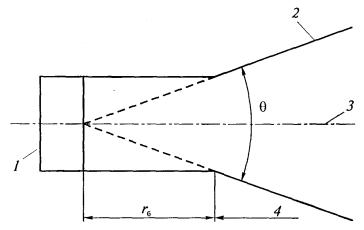 Рис. 6. Параметры акустического пучка: 1 - излучатель; 2 - граница пучка; 3 - акустическая ось пучка; 4 - дальняя зона; rб - протяженность ближней зоны; θ - угол расхождения пучка 4.4.3. Дальняя зона, зона Фраунгофера (Far field, Fraunhofer zone): 1. Область акустического поля, начинающаяся после последнего максимума ближней зоны. В дальней зоне амплитуда волны монотонно убывает с увеличением расстояния от излучателя. 2. Зона ультразвукового пучка, начинающаяся после последнего максимума давления на оси пучка [10]. 4.4.4. Переходная зона (Transitive zone) - часть дальней зоны, в которой закон изменения амплитуды волны с расстоянием отличается от закона для сферического излучателя. Для круглых и квадратных излучателей находится на расстоянии от одной до трех ближних зон. 4.4.5. Прожекторная зона (Searchlight zone) - область акустического поля, расположенная в ближней зоне излучателя, в которой волну можно считать плоской. 4.4.6. Акустический пучок, звуковой пучок, ультразвуковой пучок (Acoustic beam, sound beam, ultrasonic beam): 1. Пространственная геометрическая фигура, в пределах которой сосредоточена основная энергия упругой волны. 2. Направленно распространяющаяся акустическая волна, обычно близкая по форме к конусу, в пределах которого сосредоточена большая часть акустической энергии [10]. 4.4.7. Эффективный акустический центр (Effective acoustic center) - условная точка, из которой исходят лучи, формирующие в дальней зоне излучателя сферический фронт волны. Примечание. В общем случае может быть несколько таких точек в разных продольных сечениях акустического пучка. Это возможно, например, в поле наклонного преобразователя вследствие разных закономерностей расхождения лучей в дальней зоне в разных осевых плоскостях акустического пучка. 4.4.8. Акустическая ось преобразователя (Probe axis): 1. Линия, соединяющая точки максимальной амплитуды колебательной величины в дальней зоне излучающего в однородную среду преобразователя, и ее продолжение до эффективного акустического центра. Примечания: 1. В преобразователе с акустической задержкой направление акустической оси в среде определяется законом синусов. 2. Для преобразователя с осесимметричным активным элементом, имеющим одинаковый коэффициент преобразования во всех точках, акустическая ось совпадает с геометрической осью. 3. От акустической оси отсчитываются угловые координаты, используемые для построения характеристики направленности преобразователя. 4. Если у преобразователя имеется несколько эффективных акустических центров, то в ближней зоне возможна неоднозначность в выборе соответствующей линии, которая устраняется при рассмотрении акустического поля в фиксированной осевой плоскости. 2. Геометрическая ось, проходящая через точку выхода преобразователя и служащая направлением, от которого отсчитываются угловые координаты, используемые для построения характеристики направленности преобразователя [10]. 4.4.9. Акустическая ось пучка, центральный лун (Beam axis, central ray) - линия, соединяющая точки максимумов амплитуды волны в дальней зоне, продолженная до эффективного акустического центра. Примечания: 1. Для случая однородной среды центральный луч совпадает с акустической осью. 2. Если у преобразователя имеется несколько эффективных акустических центров, то в ближней зоне возможна неоднозначность в выборе соответствующей линии, которая устраняется 