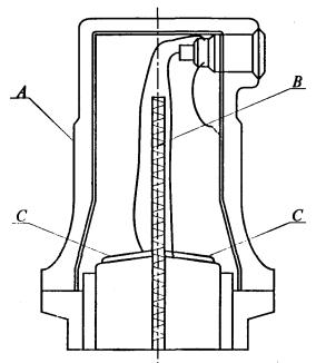 Рис. 7. Раздельно-совмещенный преобразователь ультразвукового дефектоскопа: А - корпус; В - акустическая изоляция; С - пьезоэлемент 4.5.1.15. Преобразователь продольных волн (Longitudinal wave probe, compressional wave probe) - преобразователь для излучения и (или) приема продольных волн [10]. 4.5.1.16. Преобразователь поперечных волн (Transverse wave probe, shear wave probe) - преобразователь для излучения и (или) приема поперечных волн. 4.5.1.17. Преобразователь поверхностных волн, преобразователь волн Рэлея (Surface wave probe, Rayleigh wave probe) - преобразователь для излучения и (или) приема поверхностных волн Рэлея [10]. 4.5.1.18. Преобразователь волн Лэмба (Lamb wave probe) - преобразователь для излучения и (или) приема волн Лэмба [10]. 4.5.1.19. Контактный преобразователь (Contact probe) - преобразователь, использующий контактный способ передачи упругих волн через тонкую пленку жидкости или эластичного твердого материала, а также непосредственный акустический контакт с объектом контроля без промежуточных сред. 4.5.1.20. Иммерсионный преобразователь (Immersion probe) преобразователь, используемый для контроля иммерсионным методом. 4.5.1.21. Катящийся преобразователь (Wheel probe): 1. Преобразователь, выполненный в виде колеса с шиной из эластичного материала. Работает по сухой или смоченной жидкостью поверхности объекта контроля. 2. Преобразователь, содержащий один или несколько пьезоэлементов, смонтированных внутри эластичной шины. Ультразвуковой пучок вводится в объект контроля через вращающуюся контактную поверхность шины [10]. 4.5.1.22. Струйный преобразователь (Jet probe, squirter probe) - преобразователь, использующий для акустического иммерсионного контакта с объектом контроля непрерывную струю жидкости (обычно воды). 4.5.1.23. Преобразователь с локальной ванной (Bubblier device) - преобразователь с накладываемой на объект контроля локальной иммерсионной ванной, в которую подается контактная жидкость. Расстояние от пьезоэлемента до объекта контроля - до нескольких длин волн. 4.5.1.24. Преобразователь, адаптированный к кривизне поверхности; преобразователь, сопряженный с поверхностью (Countered probe): 1. Преобразователь, контактная поверхность которого в целях улучшения акустического контакта повторяет криволинейную поверхность объекта контроля. 2. Преобразователь, форма контактной поверхности которого адаптирована к криволинейной форме объекта контроля [10]. 4.5.1.25. Хордовые преобразователи (Chord type probes) - парные (излучающий и приемный) наклонные контактные преобразователи, расположенные по одну сторону сварного шва и разнесенные друг от друга вдоль шва таким образом, что их акустические оси пересекаются в зоне контроля, а проходящая через них плоскость перпендикулярна поверхности вертикально ориентированных продольных несплошностей. Применяются для ультразвукового контроля эхометодом стыковых швов металлических и полиэтиленовых труб.
