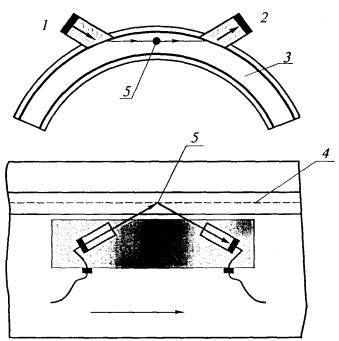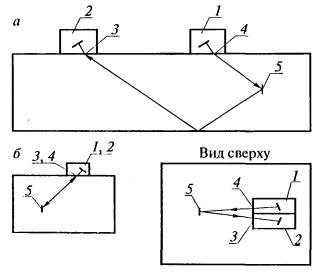 Рис. 10. Методы тандем (а) и дуэт (б): 1 - излучающий преобразователь; 2 - приемный преобразователь; 3 - точка приема эхосигнала; 4 - точка ввода; 5 - отражатель 4.7.25. Метод тандем-Т (Tandem-T technique) - разновидность эхо-зеркального метода, в котором излучается поперечная волна, а принимается трансформированная на несплошности продольная волна. Применяется при ограниченной ширине зоны сканирования. 4.7.26. Метод тандем-дуэт, метод стредл (Tandem-duet technique) - разновидность эхо-зеркального метода, основанного на применении двух одинаковых наклонных преобразователей, расположенных как по разные стороны усиления сварного шва (например, для обнаружения поперечных трещин), так и с одной стороны шва (например, для выявления продольных вертикальных трещин) таким образом, что их акустические оси пересекаются в сечении шва, а плоскости падения центральных лучей ультразвуковых пучков излучающего и приемного преобразователей расположены под углом друг к другу (обычно 100°-110°). 4.7.27. Импедансный метод (Mechanical impedance analysis method, MIA method) - метод, основанный на возбуждении в объекте контроля упругих колебаний и анализе изменений механического импеданса участка поверхности этого объекта. Применяется для дефектоскопии соединений в многослойных конструкциях. 4.7.28. Метод контактного импеданса [Ultrasonic contact impedance method (technique), UCI method] - вариант импедансного метода, основанный на анализе механического импеданса зоны сухого точечного контакта стержневого преобразователя с объектом контроля. Применяется для измерения твердости. 4.7.29. Акустическая микроскопия (Acoustic microscopy) - вариант эхо-метода, отличающийся использованием повышенных (до 100 МГц) частот, острой фокусировки и автоматического сканирования с малым шагом объектов небольшого размера. Применяется для обнаружения неглубоких дефектов размером в десятки микрометров. 4.7.30. Метод собственных колебаний (Natural vibration method) - метод, основанный на анализе собственных частот и затухания упругих колебаний, измеренных в режиме вынужденных или свободных колебаний. 4.7.31. Интегральный метод собственных колебаний (Integral natural vibration method) - метод собственных колебаний, использующий вынужденные или свободные колебания объекта контроля как единого целого. 4.7.32. Интегральный резонансный метод (Integral resonance method) - интегральный метод собственных колебаний, использующий вынужденные колебания объекта контроля как единого целого. Основное применение - контроль физико-механических свойств абразивных инструментов, бетона, керамики и других материалов. 4.7.33. Локальный метод собственных колебаний (Local natural vibration method) - метод собственных колебаний, использующий вынужденные или свободные колебания части объекта контроля. 4.7.34. Локальный резонансный метод (Local resonance method) - локальный метод собственных колебаний, использующий вынужденные колебания. Основное применение - измерение малых толщин при одностороннем доступе. 4.7.35. Метод свободных колебаний (Free vibration method) - метод собственных колебаний, использующий свободные колебания объекта контроля. 4.7.36. Интегральный метод свободных колебаний (Integral free vibration method) - метод свободных колебаний, использующий колебания объекта контроля как единого целого. Основное применение - контроль физико-механических свойств абразивных инструментов, бетона, керамики и других материалов. 4.7.37. Локальный метод свободных колебаний (Local free vibr