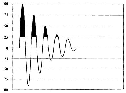 Рис. 9. Определение коэффициента демпфирования преобразователя. При затухании амплитуды импульса до 25 % максимального значения коэффициент демпфирования равен обратному числу полупериодов (4), то есть 1/4=0,25 4.5.3.32. Размер активного элемента преобразователя (Transducer size) - геометрический размер активного элемента преобразователя [10]. 4.5.3.33. Эффективный размер активного элемента преобразователя (Effective transducer size): 1. Размер фактически функционирующей части активного элемента преобразователя, рассчитанный по измеренным значениям длины волны и протяженности ближней зоны или параметрам диаграммы направленности преобразователя. Обычно не превосходит геометрического размера активного элемента преобразователя. 2. Уменьшенный размер активного элемента преобразователя, определенный измерением длины волны и протяженности ближней зоны [10]. 4.5.3.34. Путь в задержке (Delay path) - путь акустического пучка от пьезоэлемента до точки выхода преобразователя [10]. Единица измерения мм. 4.5.3.35. Апертура (Aperture) - размеры поверхности объекта контроля, через которую происходят излучение и прием упругих колебаний. Для узконаправленных преобразователей в традиционных схемах контроля апертурой называют размеры рабочей поверхности преобразователя. Для преобразователей с широкой диаграммой направленности, или с переменным углом ввода, апертура определяется размером всей зоны сканирования преобразователя, через которую происходит излучение в направлении выделенной области объекта контроля и прием эхосигналов. Единица измерения мм2. 4.6. Способы акустического контакта4.6.1. Акустический контакт (Acoustic contact) - соединение рабочей поверхности электроакустического преобразователя с объектом контроля, обеспечивающее прохождение акустических волн между ними. 4.6.2. Контактная среда, контактная пленка (Couplant, coupling medium, coupling film) - среда, помещаемая между преобразователем и объектом контроля для обеспечения прохождения акустических волн между ними. 4.6.3. Контактный способ (Contact technique) - акустический контакт преобразователя, прижатого к объекту контроля, через слой жидкости толщиной менее половины длины волны. 4.6.4. Иммерсионный способ (Immersion technique) - акустический контакт через слой жидкости толщиной, большей пространственной протяженности акустического импульса, или нескольких длин волн для непрерывного излучения [2]. 4.6.5. Щелевой способ (Gap testing technique) - акустический контакт через слой жидкости толщиной порядка длины волны [2]. 4.6.6. Струйный способ (Jet technique, squirter technique) - акустический контакт через струю жидкости, создаваемую между преобразователем и объектом контроля [2]. 4.6.7. Сухой контакт (Dry contact) - акустический контакт без применения жидкостей, смачивающих объект контроля. 4.6.8. Сухой точечный контакт (Dry point contact) - сухой акустический контакт через двояковыпуклую поверхность преобразователя (обычно сферическую или коническую), имеющий малую площадь соприкосновения с объектом контроля. 4.6.9. Бесконтактный способ (Noncontacting technique) - способ ввода и (или) приема упругих колебаний без применения жидких или твердых контактных сред. 4.6.10. Способ с воздушной связью (Air coupled technique) - способ, использующий воздух (или иной газ) в качестве контактной среды между преобразователем и объектом контроля. 4.6.11. Контактная гибкость (Contact flexibility, contact compliance) - гибкость малой по сравнению с длиной волны зоны контак