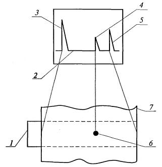 Рис. 11. Развертка типа А: 1 - прямой преобразователь; 2 - ось времени; 3 – начальный импульс; 4 - эхосигнал от дефекта; 5 - донный сигнал; 6 - отражатель (дефект); 7 - объект контроля 4.10.2. Развертка типа В, В-скан (B-scan presentation, B-scan): 1. Изображение информативных сигналов в плоскости сечения объекта контроля, перпендикулярной поверхности ввода и параллельной плоскости падения волны. Для оценки амплитуды эхосигналов часто связывают эту амплитуду с яркостью или цветом изображения. 2. Представление результатов ультразвукового контроля в виде поперечного сечения объекта контроля, перпендикулярного поверхности ввода и параллельного направлению прозвучивания. Поперечное сечение обычно представляет собой объединение А-сканов [10]. 4.10.3. Развертка типа С, С-скан (С-scan presentation, C-scan): 1. Изображение информативных сигналов в плоскости сечения объекта контроля, параллельной поверхности сканирования. Для оценки амплитуды эхосигналов часто связывают эту амплитуду с яркостью или цветом изображения. 2. Представление результатов ультразвукового контроля в виде поперечного сечения объекта контроля, параллельного поверхности сканирования [10].