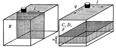 Рис. 12. Развертки типа В, С, D, F. В - развертка типа В; С - развертка типа С; D - развертка типа D; F - развертка типа F; q - поперечное перемещение преобразователя; l - продольное перемещение преобразователя; х - толщина стробируемой зоны 4.10.4. Развертка типа D, D-скан (D-scan presentation) - изображение информативных сигналов в плоскости сечения объекта контроля, перпендикулярной как к поверхности сканирования, так и к плоскости падения волны. Обычно изображение D-скан перпендикулярно изображению В-скан [10]. 4.10.5. Развертка типа Р, Р-скан (P-scan presentation) - проекция нескольких B-сканов или С-сканов [10].