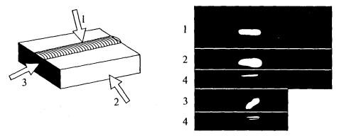 Рис. 13. Развертка типа Р: 1 - вид сверху; 2 - вид спереди; 3 - вид сбоку; 4 - эхосигналы 4.10.6. Развертка типа F, F-скан (F-scan presentation) - модификация развертки типа С. Вместо амплитуд сигналов представляются и регистрируются другие их параметры, например центральные частоты импульсов [10]. 4.10.7. Пространственное представление, трехмерное представление (Volume scan presentation, 3D-presentation) - трехмерное пространственное изображение проконтролированного объема. В каждой точке на поверхности сканирования регистрируют полный набор A-сканов [10].