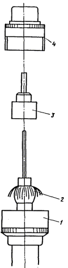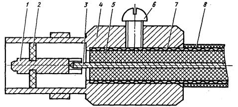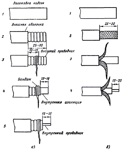 Рис. 2.3. Шайба. Материал - фторопласт-4 или полиэтилен Рис. 2.4. Соединение кабеля с разъемом. 1 - центральная втулка разъема; 2 - шайба; 3 - центральный проводник кабеля; 4 - корпус разъема; 5 - изоляция кабеля; 6 - винт М6; 7 - внешний проводник кабеля; 8 - оболочка кабеля Рис. 2.5. Разделка концов кабелей для армирования разъемами: а) - абонентские; б) - распределительные и магистральные 3. ПРИЕМКА ЗДАНИЙ, ПОМЕЩЕНИЙ И КАБЕЛЬНОЙ КАНАЛИЗАЦИИ ПОД МОНТАЖ3.1. Общие положения3.1.1. До начала монтажа оборудования должны быть приняты общестроительные работы, выполненные в зданиях, и кабельная канализация в целом, а также отдельные помещения в составе, обеспечивающем монтаж комплекса оборудования, хранение принятого оборудования и материалов. 3.1.2. Требования к помещениям, предназначенным для установки оборудования систем и к кровлям. 3.1.2.1. АМС должны устанавливаться на плоских горизонтальных кровлях. В случае необходимости кровля здания должна быть усилена по рекомендации проектной организации. Антенны могут также устанавливаться на отдельно стоящих на земле мачтах. 3.1.2.2. Головные станции должны устанавливаться в специально отведенных помещениях*, площадью не менее 10 м2 и высотой не менее 2,5 м. Помещения должны быть обеспечены: электроснабжением от отдельного ввода и занулением, электроосвещением и соответствовать требованиям ТУ на оборудование и нормы СНиП на технологические помещения с обслуживающим персоналом. * Как правило в квартирах на первых этажах зданий с обеспечением охранной сигнализацией. 3.1.2.3. Электроснабжение помещения ГС должно быть выполнено от отдельного ВРУ собственной линией трехжильным проводом сечением не менее 2,5 мм2 с установкой в помещении ГС автомата ввода с током срабатывания 6 А. 3.1.2.4. Усилители магистральных, субмагистральных и домовых сетей должны устанавливаться в служебных помещениях или в подъездах в специальных шкафах, обеспеченных электроснабжением и электроосвещением, в соответствии с ТУ на оборудование. 3.1.3. Требования к местам прокладки кабеля. 3.1.3.1. Коллекторы, в которых прокладываются кабели, должны соответствовать требованиям СНиП. 3.1.3.2. Трассы прокладки кабелей магистральных и субмагистральных сетей должны соответствовать проекту и «Общей инструкции по строительству линейных сооружений ГТС» (8). 3.1.4. До устройства воздушных кабельных линий должны быть выполнены работы согласно проекту и «Общей инструкции по строительству линейных сооружений ГТС». 3.2. Приемка под монтаж при новом строительстве3.2.1. Приемка под монтаж объекта может осуществляться поэтапно согласно проекту. 3.2.2. В зданиях должны быть закончены общестроительные работы. 3.3. Приемка под монтаж в зданиях сложившейся застройки3.3.1. Не допускается включение в зону действия систем зданий, подлежащих сносу или капитальному ремонту с выселением в течение 5 лет со дня сдачи системы в эксплуатацию по сведениям владельцев зданий (указывается в задании на проектирование). 3.4. Проверка и уточнение места установки приемной антенной системы3.4.1. Проверка предусмотренного проектом места установки антенн производится при помощи испытательных антенн. 3.4.2. Уточнение места производится с целью получения требуемого качества ТВ-изображения по каждому ТВ каналу. При наличии нескольких антенн настройка осуществляется последовательно для каждой антенны, испол