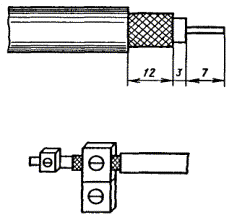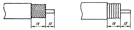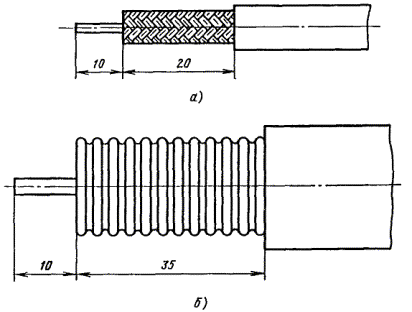 Рис. 8.3. Последовательность операций по разделке кабелей: а) - со сплошным фольгированным внешним проводником; б) - с оплеточным внешним проводником По размерам, указанным на рис. 8.3 удаляют внешнюю оболочку кабеля, не повреждая внешнего проводника. На внешний проводник кабеля, выполненный из фольги, накладывают и пропаивают бандаж из 3-4 витков медного провода диаметром 0,4÷0,5 мм. Часть внешнего проводника удаляется. Надрезают внутреннюю изоляцию кабеля, не повреждая внутреннего проводника, после чего скручиванием удаляют изоляцию. Внутренний проводник разделанного кабеля облуживают. В случае применения кабеля с внешним проводником в виде оплетки после снятия внешней оболочки оплетку расплетают и скручивают в две одинаковые косички. 8.4.2. При монтаже кабелей в оборудование разделанные концы кабелей заводят под имеющиеся на оборудовании держатели. Внутренний проводник кабеля вводят в отверстие монтажного лепестка и механически закрепляют на нем путем загибания или обкручивания. Лишнюю часть проводника удаляют. Расстояние от внутренней изоляции кабеля до монтажного лепестка должно быть 1-3 мм. Косички внешнего оплеточного проводника или конец проволочного бандажа обкручивают вокруг имеющихся в оборудовании корпусных контактов. Лишнюю часть проводников удаляют. Длина проводников до контактов должна быть минимальной. Проводники, закрепленные на контактах и лепестках, опаивают. Плоскогубцами обжимают держатели на оболочке кабеля. Удаляют остатки флюса, закрашивают места пайки цапонлаком. При невозможности механически закрепить толстый внутренний проводник кабеля в отверстие монтажного лепестка, проводник накладывают на лепесток, бандажируют 5-6 витками медной проволоки диаметром 0,25-0,35 мм и опаивают. 8.5. При пайке и облуживании кабелей используют припой ПОС 40, ПОССу 40-2, ПОС 61, ПОССу 61-05 и бескислотные флюсы. ПРИЛОЖЕНИЕ 1Таблица пересчета импульсных сопротивлений растеканию тока заземлителей устройства молниеотвода на сопротивление растеканию тока промышленной частоты