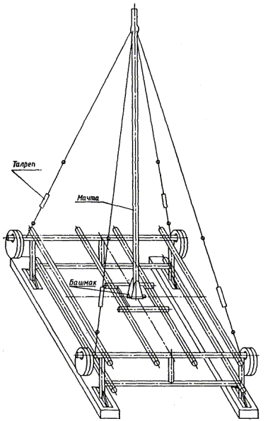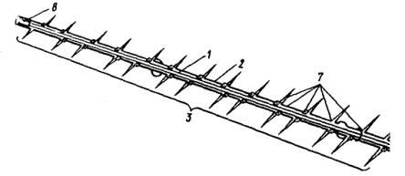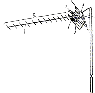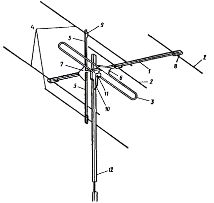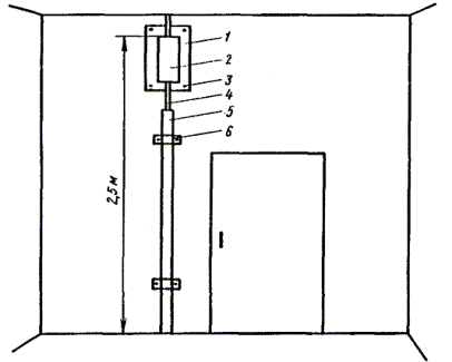 Рис. 4.7. Общий вид сдвоенной антенны крепления сдвоенной антенны на одной мачте: 1 - антенна АТКГ(В); 2 - мачта; 3 - оттяжки; 4 - кронштейн; 5 - соединительный кабель; 6 - кабели снижения 1 и 2 антенн 4.2.2.4. Выполняют операции по пп. 4.2.1.5 - 4.2.1.15. Примечание. Расстояние до антенн IV-V ТВ диапазонов от других антенн не должно быть меньше 0,6 м. 4.3. Монтаж канальных и диапазонных антенн для нормальных условий приема4.3.1. Монтаж антенн осуществляется в соответствии с технической документацией. Последовательность операций по монтажу в соответствии с разделом 4.2. 4.4. Монтаж нескольких антенн для приема по одному ТВ каналу4.4.1. В случаях, определяемых проектом, для приема радиосигнала по каждому ТВ каналу могут быть установлены несколько однотипных антенн. При этом монтаж таких антенных систем производится в строгом соответствии с проектом, согласно разделу 4.2 настоящей инструкции и должен обеспечивать возможность фазирования антенн каждого ТВ канала в соответствии с «Временной инструкцией по настройке КСКПТ и СКТВ»* (раздел «Настройка антенных систем»). * Приводится в настоящем сборнике. 4.4.2. Устройство сложения сигналов должно устанавливаться в помещении головной станции. Подключение кабелей к УСС производится в соответствии с гл. 8 настоящей инструкции и технической документацией на УСС. 5. МОНТАЖ ГОЛОВНЫХ СТАНЦИЙ5.1. Размещение головных станцийГоловная станция системы монтируется в специально отведенном для ее установки помещении. 5.2. Монтаж ГС производства ВНР5.2.1. Монтаж ГС производится в соответствии с документацией завода-изготовителя. 5.2.2. Головная станция устанавливается на столе с учетом свободного доступа к органам управления и настройки. 5.2.3. Укрепляют конверторы и блок питания с помощью штатных винтов. 5.2.4. Монтируют разъемы, входящие в комплект ГС на выходные кабели согласно гл. 8 настоящей инструкции. 5.2.5. Проводят внутренний монтаж ГС в соответствии с документацией завода-изготовителя. 5.2.6. Подключают разъемы к соответствующим антенным входам ГС. 5.2.7. Разделывают и подключают магистральный кабель к выходу ГС в соответствии с гл. 8 настоящей инструкции. 5.2.8. Производят соединение корпуса ГС с глухозаземленной нейтралью в соответствии с ПУЭ и проектом. 5.3. Монтаж ГС серии 1005.3.1. Снимают защитный кожух головной станции. 5.3.2. Шасси головной станции устанавливают на стене с помощью трех забетонированных шпилек М10 (длина выступающей из стены части шпилек должна быть не менее 35 мм). Допускается установка ГС на металлической раме, надежно закрепленной на стене. ГС устанавливается на высоте 0,7-1 м от пола помещения до нижней кромки шасси таким образом, чтобы обеспечивалось удобство монтажа и обслуживания. 5.3.3. Подключают кабели снижения к входным фильтрам и закрепляют их скобкой на шасси. 5.3.4. Производят соединение клеммы «земля» ГС с глухозаземленной нейтралью в соответствии с ПУЭ и проектом. 5.3.5. Подключают устройство ввода УВ-100 и монтируют в него магистральный кабель в соответствии с паспортом на ГС. 5.3.6. Подключают сетевой шнур к блоку питания (не подключая вилку шнура к сети 220 В). 5.3.7. Закрывают ГС защитным кожухом. 5.4. Монтаж ГС серии 2005.4.1. Укрепляют в полу помещения ГС четыре шпильки с резьбой М10 и производят монтаж и установку ГС в соответствии с паспортом, на ГС. ГС устанавливается таким образом, чтобы при открытой задней двери и выдвинутых блок