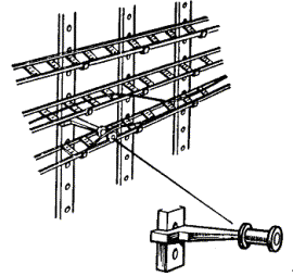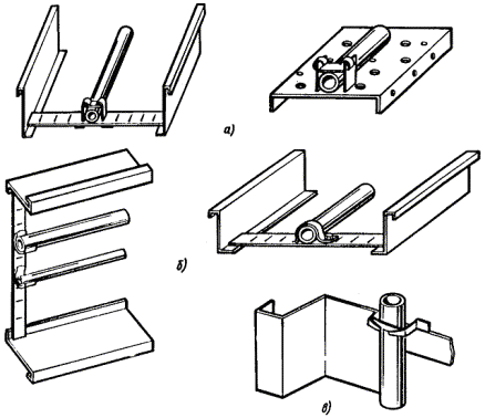 При протяжке скорость тяжения должна быть постоянной и не превышать 30 м/мин. Затягивание кабелей допускается при температуре не ниже минус 10 °С. При более низких температурах необходимо обеспечить предварительный прогрев кабеля на барабане. При протяжке кабеля через несколько пролетов, в каждом колодце должен быть рабочий, обеспечивающий предохранение кабеля от повреждения при выходе и входе в канал, а также для подтягивания кабеля. В случае возникновения необходимости замены кабеля его вытягивают из канализации вручную или с помощью ручной лебедки. 6.1.3. Прокладка кабелей в коллекторах. До начала прокладки по проекту определяют протяженность трассы и в соответствии с этим определяют способ прокладки. При прокладке кабель подают через люк, выходящий на поверхность земли. При небольшой длине трассы кабель выносят вдоль всего коллектора на руках бригадой рабочих и укладывают на консоли. При большой длине трассы кабель протягивают по роликам, установленным на полу коллектора. Место расположения кабеля на консолях должно быть определено рабочими чертежами. Прокладка и крепление кабелей в глубоких коллекторах и вертикальной плоскости на спусках и подъемах должны определяться отдельными проектными решениями. 6.1.4. Устройство подземного ввода кабеля в здание. Уличная подземная кабельная канализация вводится непосредственно в подвал или техническое подполье здания. В случае отсутствия непосредственного ввода в здание или невозможности прокладки кабеля по подвалу (техподполью), кабель выводится из подземной канализации по трубопроводу на наружные стены дворовых или боковых фасадов зданий и далее проходит открытой прокладкой по стене здания. В технические подполья, в которые осуществляется ввод кабеля, должен быть обеспечен беспрепятственный доступ обслуживающего персонала. 6.1.5. Прокладка кабелей в технических подпольях и по техническим этажам. Кабели в технических подпольях, по техническим этажам в зависимости от серии здания, с учетом требований по климатическим условиям, механическим воздействиям, электро- и пожаробезопасности, а также требований по проведению ремонтно-восстановительных работ, прокладывают: на стальных сварных лотках, на подвесках из оцинкованной стали, в металлорукавах, в пластмассовых и отдельных случаях - стальных трубах, открыто по стенам. 6.1.6. Подвеска кабелей на стоечных воздушных переходах. Подвеска кабеля на стоечных воздушных переходах должна осуществляться в соответствии с разделом 8.7 «Общей инструкции по строительству линейных сооружений ГТС» [8]. 6.1.7. Способы прокладки кабелей. 6.1.7.1. Прокладка кабелей на стальных лотках и полках производится на уже имеющихся, предусмотренных рабочей документацией лотках и полках или на вновь устанавливаемых конструкциях. Лотковые магистрали нужной длины составляют из отдельных лотков, соединяемых между собой при помощи поставляемых в комплекте с лотками соединительных деталей. Расстояние от лотковых магистралей до потолков и перекрытий, а также между магистралями должно быть не менее 200 мм, а от уровня пола до низа конструкции - не менее 1300 мм. Рис. 6.1. Пример прокладки кабеля на лотках по раскатным роликам Рис. 6.2. Примеры крепления проложенного в лотках кабеля: а) - полосками; б) - скобами; в) - пряжками При сближении и пересечении лотков с трубопр