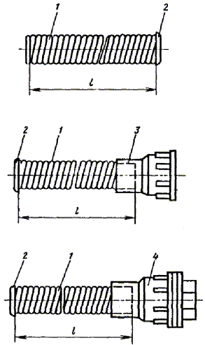 Рис. 6.5. Примеры заготовки металлорукавов для защиты кабеля: 1 - металлорукав типа РЗ-Ц-Х; 2 - втулка типа ВО; 3 - соединитель «металлорукав-труба» типа СМТ; 4 - соединитель «металлорукав-короб» типа СМК. l - длина металлорукава, определяемая по длине участка, на котором он должен устанавливаться Концы металлорукавов, в которые прокладывают кабель, должны иметь оконечные заготовки, показанные на рис. 6.5. 6.1.7.3. Открытая прокладка кабелей. В зданиях, не имеющих специальных закладных устройств, кабели прокладывают открыто по стенам зданий.