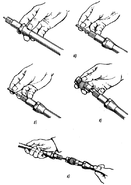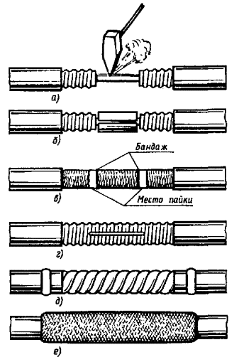 Рис. 6.13. Последовательность операций при сращивании концов кабелей неразъемным соединителем (пайкой): а) - пайка внутреннего проводника в медной гильзе; б) - установка полиэтиленового вкладыша; в) - монтаж кабеля с оплеточным внешним питомником; г) - восстановление внешнего проводника; д) - защита восстановленного внешнего проводника полиэтиленовой лентой и установка сэвилена; е) - смонтированная муфта, полиэтиленовая оболочка восстановлена термоусаживаемыми трубками При восстановлении гофрированного внешнего проводника над сростком устанавливают гофрированную вставку и также закрепляют на концах проволочным бандажом. Места стыков вставок с внешним проводником и бандажи пропаивают припоем ПОССу 40-2 с применением раствора канифоли в спирте. Поверх восстановленного внешнего проводника наматывают несколько слоев полиэтиленовой ленты до выравнивания диаметров полиэтиленовой оболочки и монтируемого участка. Рядом с обрезами полиэтиленовой оболочки с обеих сторон устанавливают по одному пояску ленточного герметика (рис. 6.13, а). Над восстанавливаемым участком, с равным перекрытием поясков герметика, устанавливают и усаживают открытым пламенем термоусаживаемую трубку меньшей длины. Затем рядом с торцами усаженной ТУТ устанавливают еще по одному пояску герметика и усаживают над ними вторую ТУТ большего размера рис. 6.13, е. При отсутствии термоусаживаемых трубок восстановление полиэтиленовой оболочки выполняют полиэтиленовой муфтой. Типоразмеры муфт указаны в табл. 2. Таблица 2
