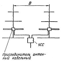 Общая оценка определяется как среднеарифметическое оценок всех наблюдателей. ПРИЛОЖЕНИЕ 1МЕТОДИКА ОПРЕДЕЛЕНИЯ МЕСТА УСТАНОВКИ ПРИЕМНОЙ АНТЕННОЙ СИСТЕМЫ1.1. Определение места установки антенн производить для каждого телевизионного канала и диапазона УКВ ЧМ вещания в отдельности. Уровни радиосигналов на выходах кабелей снижения антенн должны быть не менее номинальных входных уровней используемых головных станций (см. табл. 4.1 настоящей инструкции), а субъективная оценка качества изображения не менее 4 баллов (см. п. 7.9 настоящей инструкции). При проведении работ по пп. 1.5-1.8 настоящей методики выбирается экономически оправданная антенная система, обеспечивающая наилучшее качество приема при достаточном уровне сигнала на входе головной станции (при необходимости с использованием антенных усилителей). В антенных системах, как правило, должны использоваться канальные антенны или диапазонные в качестве канальных. 1.2. В целях сокращения числа антенных опор рекомендуется проверять возможность установки на одних и тех же мачтах наибольшего количества антенн, размещаемых на опоре в соответствии с «Временной инструкцией по монтажу КСКПТ и СКТВ». 1.3. При определении мест установки антенн необходимо руководствоваться следующими указаниями: запрещается на одной мачте (трубостойке) монтировать телевизионную антенну и провода радиотрансляционной, телефонной и других сетей; запрещается располагать оттяжки антенных мачт над проводами радиотрансляционных, телефонных и других сетей; элементы поваленной антенны не должны выходить за пределы кровли здания или соприкасаться с проводами радиотрансляционной, телефонной и других сетей; расстояние от антенных опор до проводов радиотрансляционной, телефонной и других сетей должно быть не менее 3 м, а до проводов сетей с напряжением 960 В - не менее 4 м; расстояние между антеннами и металлическими предметами на кровле здания должно быть не менее 1,5 м, а расстояние между антеннами и коммунальными устройствами - не менее 1 м. 1.4. Определение мест установки антенн производить с помощью оборудования, приведенного в табл. П.1.2 настоящей методики. В ряде случаев, на высоких зданиях с плоской кровлей, лучшее качество может быть получено при установке антенны на сравнительно небольшой высоте (до 1,5 м) над кровлей и на таком удалении от края кровли, при котором сохраняется прямая видимость на передающие антенны телецентра и обеспечивается экранировка радиоволн, отраженных от земли. Следует также использовать в качестве экранов для отраженных сигналов лифтовые и другие надстройки, расположенные на кровлях. Результаты измерений в наилучших и наихудших точках приема с одиночной антенной занести в протокол по форме приложения 2 «Временной инструкции по настройке КСКПТ и СКТВ». Для этого вблизи точки с наиболее приемлемым качеством изображения установить антенну и сориентировать ее по азимуту на максимум сигнала. Затем установить вторую такую же антенну, как показано на рис. П.1.1, на той же высоте и сориентировать ее так же, как и первую. Антенны с помощью кабелей снижения подключить к УСС. На выходе УСС измерить уровень радиосигнала, если наблюдается резкое уменьшение сигнала, то присоединитель антенный кабельный одной из антенн нужно повернуть на 180°. Если уровень возрастает примерно на 3 дБ, то сист