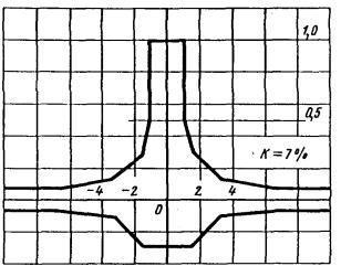 Рис. П.3.1. Схема измерения импульсной характеристики Телевизионный демодулятор, подключенный к выходу абонентского отвода, настраивают на прием радиосигнала изображения в канале распределения. Размах полного телевизионного сигнала на выходе демодулятора устанавливают равным 1 В. К выходу демодулятора подключают низкоомный вход осциллографа, установленный в режим работы с БВС. Измерение импульсной характеристики проводят по синусквадратичному 2Т-импульсу (элемент В1), сигнала № 2 испытательной строки, расположенному в 20 строке первого поля и в 333 строке 2 поля. С помощью БВС осциллографа выделяют 20 или 333 строку поля и устанавливают осциллограмму сигнала в центре экрана в масштабе, при котором полный размах сигнала от уровня «черного» до уровня «белого» укладывается в 5 клеток вертикального масштаба осциллографа при коэффициенте отклонения канала вертикального усиления 0,1-0,2 В/см. Коэффициент развертки осциллографа устанавливают в положение 0,2 мкс/дел. и осциллограмму сигнала синусквадратичного 2Т-импульса ручкой «задержка» осциллографа устанавливают таким образом, чтобы уровень «черного» совпал с осью горизонтальной развертки осциллографа (0 %), уровень белого - с уровнем, принимаемым за единицу (100 %) - 5 делений вертикального масштаба. На экране осциллографа накладывают (наносят) трафарет поля допуска импульсной характеристики (рис. П.3.2). Рис. П.3.2. Трафарет поля допуска импульсной характеристики для К-фактора 7 % Осциллограф С1-81 Рабочая часть экрана: по вертикали - 8 дел. (цена 1 д. - 10 мм) по горизонтали - 10 дел. (цена 1 д. - 10 мм) Коэффициент отклонения - 0,2 В/дел Коэффициент развертки - 0,2 мкС/дел Режим работы с БВС Ручкой осциллографа «задержка» устанавливают осциллограмму синусквадратичного 2Т-импульса относительно наложенного трафарета так, чтобы точки перегиба линий трафарета на уровне 50 % располагались симметрично относительно оси, проходящей через нулевую точку оси времени. Величину К-фактора определяют по полю допуска трафарета при условии, что осциллограмма синусквадратичного 2Т-импульса не выходит за линии трафарета и имеет касание с ними в отдельных точках. Координаты точек перегиба границ поля допуска для значений К-фактора от 4 до 10 % приведены в табл. П.3.1. Перечень рекомендуемой контрольно-измерительной аппаратуры приведен в табл. П.3.2. Координаты точек перегиба линий трафаретов для К-фактора 4-10 %