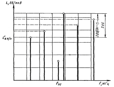 где Lсг.вых - выходной уровень оборудования ГС в ТВ канале, дБ/мкВ. Для используемого типа оборудования Lcг.вых=114±3 дБ/мкВ; L`мвх - входной уровень магистрального усилителя в ТВ канале. На данном этапе L`мвx рассчитываем при условии равенства уровней сигналов по всем ТВ каналам. В этом случае при усилении сигналов N ТВ каналов и каскадном включении (n - 1) широкополосного усилителя максимальный выходной уровень сигнала в ТВ канале
