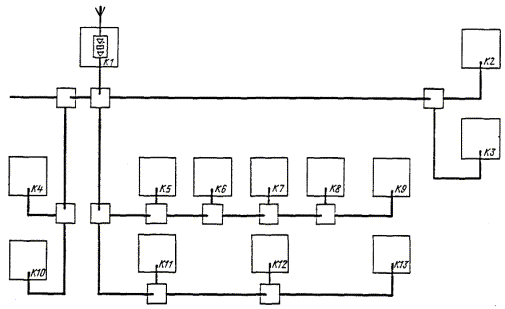 где Еср - среднее значение напряженности поля на кровлях зданий, расположенных в районе создания системы. При выборе варианта построения сети можно исходить из условия, что система без преобразования частот метровых каналов может быть реализована в тех зонах, для которых найденная величина минимально допустимого уровня на выходе абонентского отвода не превышает порядка 70 дБ/мкВ. В противном случае следует рекомендовать создание систем с преобразованием частот метровых каналов. В населенных пунктах, занимающих большую территорию, могут встретиться ситуации, когда на некоторой части территории требуется создание систем с преобразованием частот метровых каналов, в то время как на другой ее части возможно построение систем с распределением сигналов на принимаемых частотах. Решение в этом случае принимается с учетом конкретных условий. Однако из соображений применения единого технического решения более предпочтительным является создание систем с преобразованием частот метровых каналов на всей территории населенного пункта. Определение каналов распределения в кабельной сети производится по согласованию с компетентными организациями, осуществляющими распределение частот ТВ вещания в стране. Следует отметить, что при выборе каналов распределения в сети желательно избегать сочетаний каналов, при которых каналы распределения оказываются смежными по отношению к каналам приема. Однако при наличии 4 ... 5 ТВ программ данного условия выполнить не удается. В этом случае при проектировании системы необходимо учитывать возможность появления помех, обусловленных наличием наведенных в соседних каналах сигналов. Данное обстоятельство обуславливает необходимость определения на стадии изыскательских работ уровня сигналов на выходе абонентского отвода, при котором исключается влияние указанных помех. Практически установлено, что при распределении сигналов по сети в каналах смежных по отношению к каналам приема минимально допустимый уровень на выходе абонентского отвода примерно на 20 дБ ниже по сравнению с аналогичным параметром в той же точке системы без преобразования частоты. Необходимой частью предпроектных работ являются изыскания с целью определения точек установки приемных антенн. Изыскания проводятся по методике, изложенной в (12), и завершаются выдачей исходных данных по уровням и качеству принимаемых сигналов. Если выходной уровень на выходе кабеля снижения по какому-либо каналу оказывается ниже номинального входного уровня оборудования ГС, то предусматривается использование антенных усилителей или более сложных антенных устройств с большим коэффициентом усиления и меньшим затуханием в кабеле снижения. С учетом принятых мест установки антенн и данных по геоподоснове обслуживаемого района проводится трассировка линий распределительной сети и намечаются возможные точки установки усилителей и ответвителей. Исходя из необходимой протяженности линий и имеющейся номенклатуры оборудования и кабелей (см. приложение 1) выбираются типы усилителей, ответвителей и коаксиальных кабелей. На основании параметров выбранных устройств и мест их установки определяется число усилительных участков на линии максимальной протяженности. При этом необходимо принять во внимание, что при расчете сети приведенные с