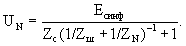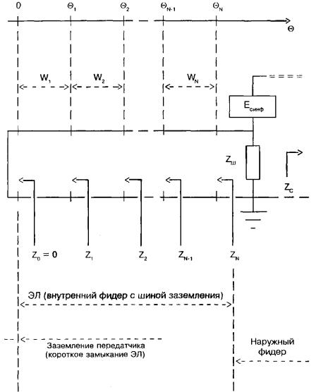b - толщина шины. Для расчета волнового сопротивления наружного фидера по однотактной волне (т.е. величины Zc) используется тот же метод, что и для нахождения волновых сопротивлений однородных участков. Для оценки величины Eсинф используется нормируемый показатель - максимально допустимая асимметрия токов на выходе двухтактного каскада, т.е. предполагается, передатчик исправен. Амплитудное значение Eсинф принимается равным 2 … 3 % от амплитудного значения противофазной составляющей напряжения при 100 % модуляции. Цепь на выходе ЭЛ (см. рис. 1) представляет собой делитель напряжения, одним плечом которого является импеданс Zc, другое образовано параллельным соединением Zш и ZN. Следовательно, напряжение в сечении ЭЛ Θ = ΘN определяется соотношением: