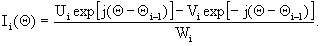 Далее, на четвертом этапе, находится ток ЭЛ. Для этого в пределах каждого i-го однородного отрезка вводятся амплитуды падающей Ui и отраженной Vi волн напряжения, отнесенные ко входному сечению данного отрезка (так что имеет место равенство Ui + Vi = ui-1). Величины Ui и Vi находятся из условия выполнения закона Ома во входном сечении и непрерывности напряжения в ЭЛ как функции Θ. Опуская громоздкие промежуточные выкладки запишем рекуррентные соотношения для Ui, Vi и напряжений ui в сечениях Θ1, Θ2, … Θi, … ΘN-1 (напряжение un уже найдено):