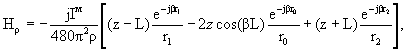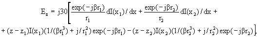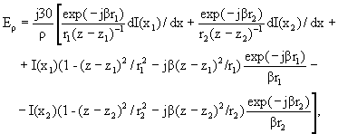 Таким образом, на первых четырех этапах находится распределение тока по каждому однородному отрезку ЭЛ. Пятый этап. Выражения для составляющих поля Ez, Eρ, Hφ, создаваемых прямолинейным кусочно-синусоидальным током в некоторой точке наблюдения с координатами ρ, z в цилиндрической системе координат, ось аппликат которой совпадает с линией тока и направлена в соответствии с его положительным направлением: