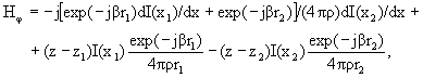 где z1 и z2 - аппликаты начала и конца данного прямолинейного однородного отрезка ЭЛ, соответственно; r1 и r2 - расстояние до точки наблюдения от начала и конца отрезка, соответственно; I(x) - токовая функция; x - криволинейная координата - расстояние до передатчика по фидеру; x1 и x2 - координаты x начала и конца отрезка, соответственно. Аналогичным образом находится поле, создаваемое током шины (равным по модулю и противоположным по фазе току экрана фидера). 3.1.2. ИЗЛУЧЕНИЕ ЭКРАНОВ КОАКСИАЛЬНЫХ ФИДЕРОВ ПЕРЕДАТЧИКОВ С НЕСИММЕТРИЧНЫМ ВЫХОДОМПоле, создаваемое током коаксиального фидера передатчика с несимметричным выходом рассчитывается как и в случае бикоаксиального фидера за пять этапов. Процедура расчета отличается только третьим этапом, т.е. иначе рассчитываются параметры выходной цепи ЭЛ и ее выходное напряжение. Рассмотрим третий этап для коаксиального фидера. В данном случае обратный ток частично течет по проволочному экрану концентрического фидера, частично - по земле. Мерой удельного веса тока земли в общем обратном токе является коэффициент прозрачности проволочного экрана kп. Суммарный обратный ток перетекает на внутреннюю поверхность экрана коаксиального фидера передатчика с проволочного экрана, шины заземления и внешней своей поверхности. Последняя составляющая и есть ток ЭЛ. В эквивалентной схеме ток земли течет по параллельному соединению импедансов Zш (вертикальный участок шины) и ZN (входной импеданс последнего N-го однородного отрезка ЭЛ, - см. рис. 1). При расчете тока земли сначала находится коэффициент прозрачности проволочного экрана k формуле: kп = 1 - C12/C11, (3.14) где C12 - взаимная погонная емкость между центральным проводом и проволочным экраном концентрического фидера; C11 - собственная емкость центрального провода. Емкости C11 и C12 находятся решением электростатической задачи (методом, описанным в предыдущем пункте) при потенциале центрального провода фидера 1 В и при нулевых потенциалах проволочного экрана и земли: величины C11 и C12 при этом совпадают с абсолютными значениями погонных зарядов центрального проводника и экрана, соответственно. Затем вычисляется ток земли Iз формуле: Iз = kпI0, (3.15) где I0 - ток центрального провода, который находится как выходной ток передатчика в предположении высокого уровня согласования антенны. Напряжение на выходе ЭЛ un рассчитывается как падение напряжения на параллельном соединении Zш и ZN при протекании тока Iз: un = Iз/(1/Zш + 1/ZN). (3.16) В остальном, как уже отмечалось выше, расчет аналогичен случаю бикоаксиального фидера передатчика с симметричным выходом. 3.1.3. ИЗЛУЧЕНИЕ ЩЕЛЕЙ ШКАФОВ ПЕРЕДАТЧИКОВЩели шкафов передатчиков рассматриваются как короткие магнитные вибраторы, возбужденные кусочно-синусоидальным эквивалентным магнитным током щели с амплитудой в пучности Iм. На основе принципа перестановочной двойственности уравнений Максвелла получены замкнутые выражения для φ-составляющей электрического, ρ- и z-составляющих магнитного полей в цилиндрической системе координат, ось аппликат которой совпадает с осью вибратора, начало координат - с его центром: